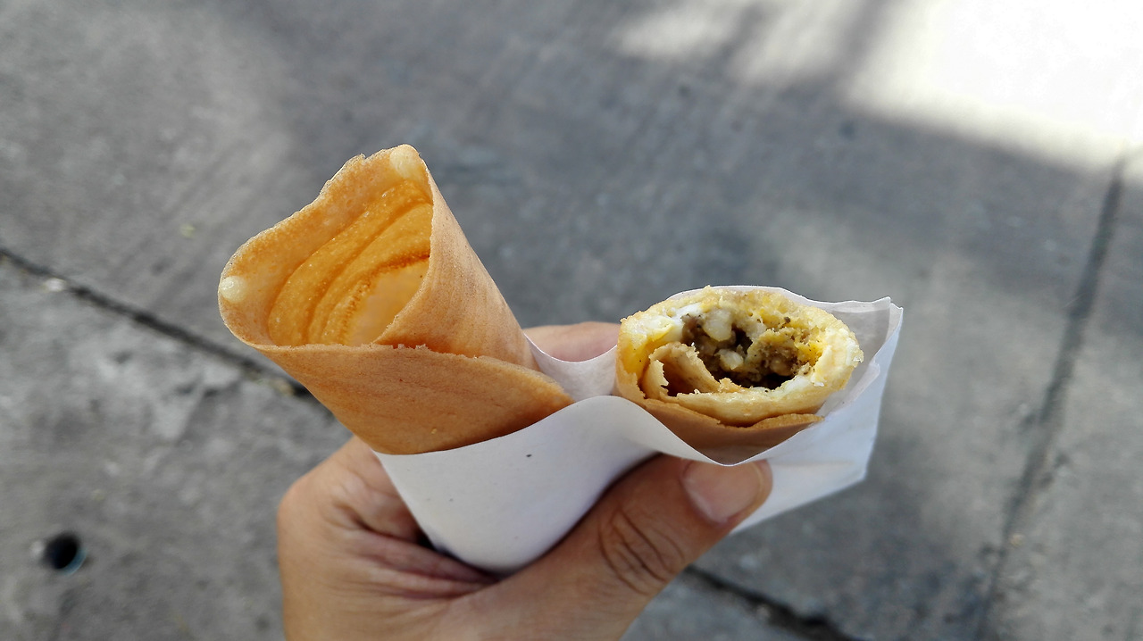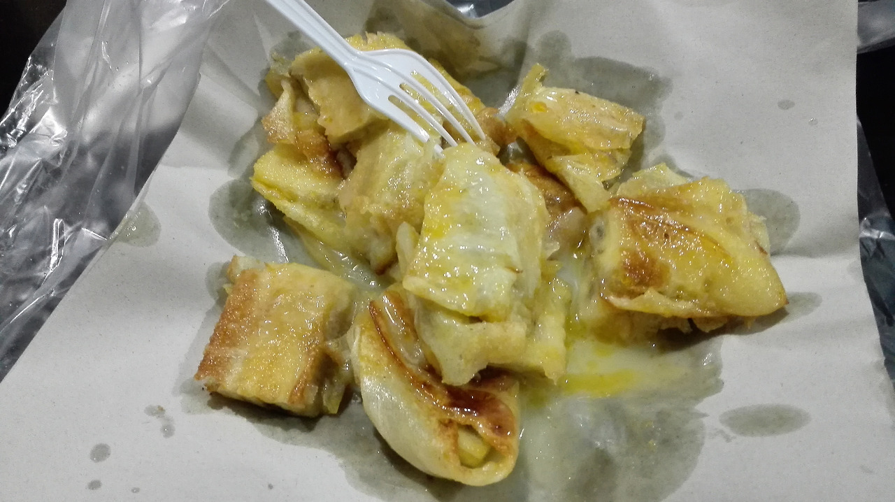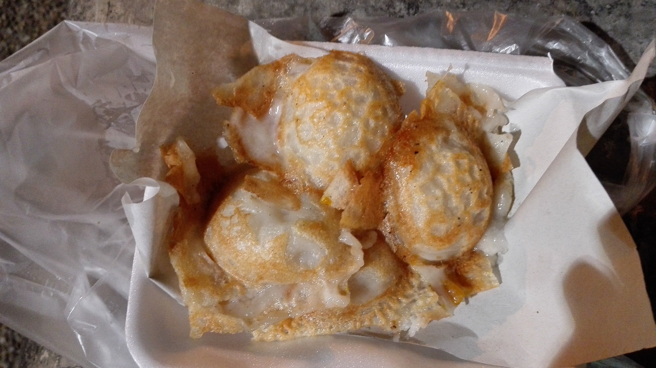 # 이름 모를 간식. 메추리알 전병이라고 부르면 맛을 듯. 안에 든 고기에 짭짭하게 간이 되어 있어 땀 흘리고 난 뒤 염분 보충으로 좋을 듯하다. 맛도 괜찮다.