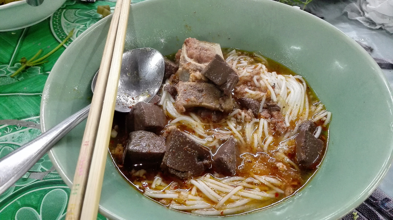 # 텅러 지하철 역 앞에서 먹은 국수. 오리고기 국수를 달라고 했는데의사 전달이 제대로 안 된 건지 돼지 간이 들은 국수를 줬다. 입 맛에 안 맞았다.
