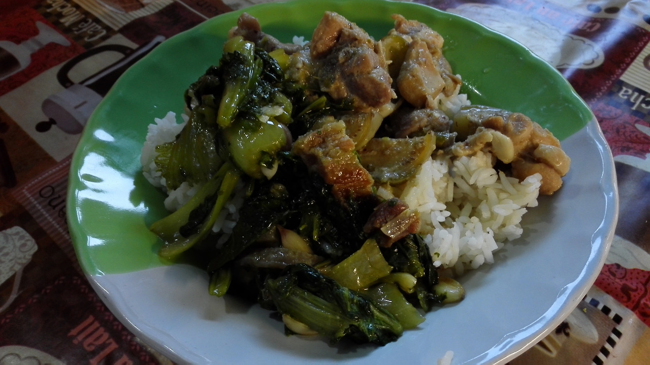 # 4섬 투어 당일, 오전 일찍 문 연 식당이 없어 숙소 근처에서 비싸게 주고 먹은 아침. 돼지고기와 아스파라거스를 볶은 음식.