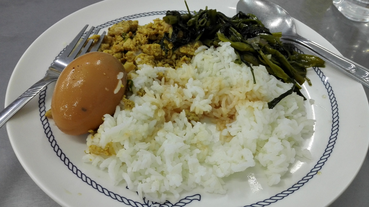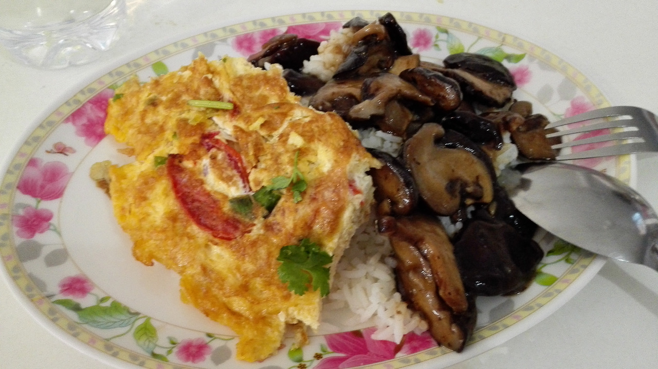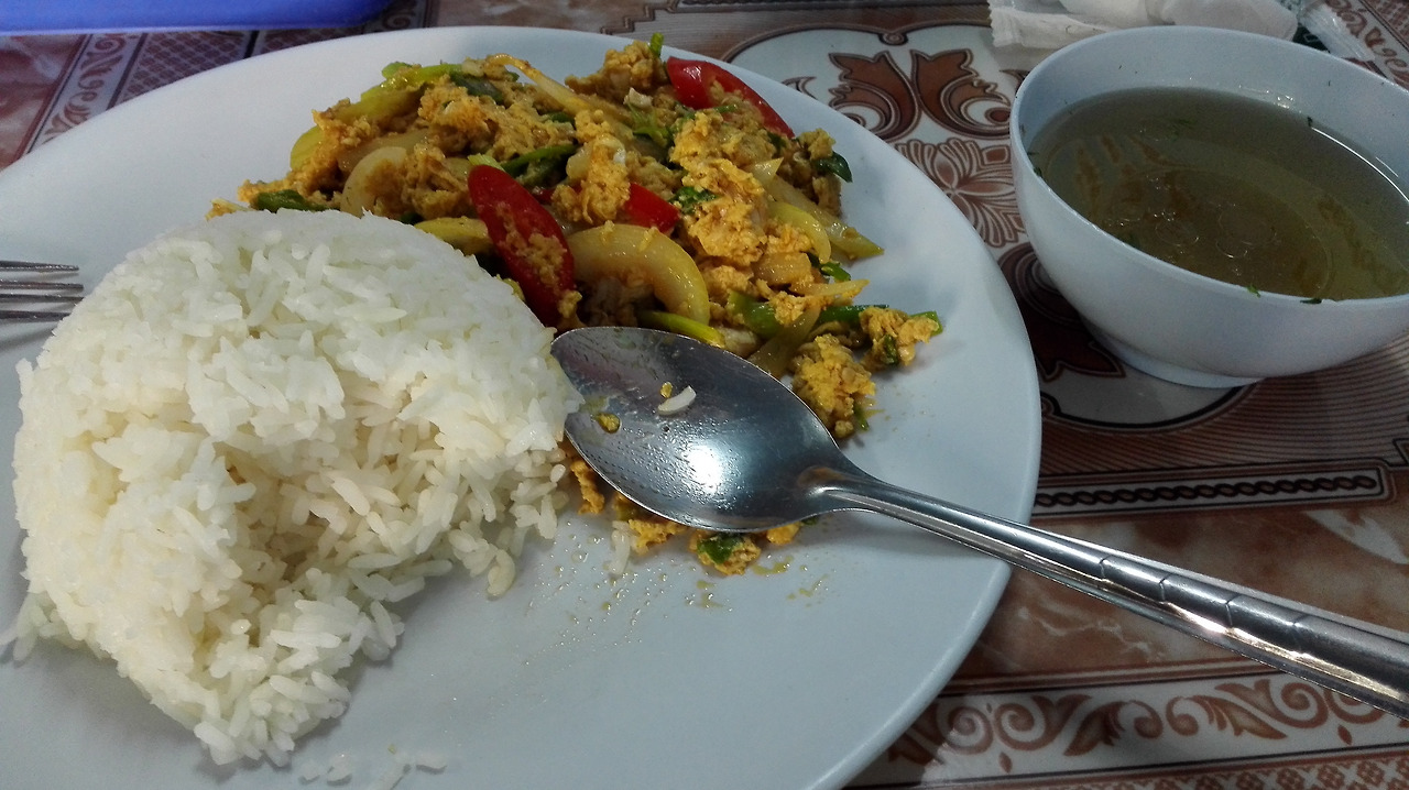# 텅러 거리에서 먹은 부페식 식사. 밥에다 계란 전과 버섯 볶음을 골라 먹었다.