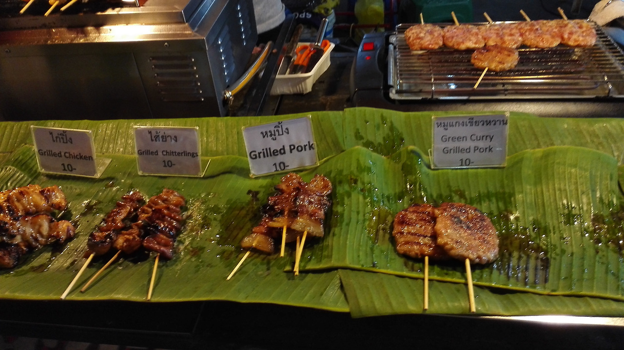 # 치앙마이 게이트 시장에서 먹은 간식. 난 Green Curry Grilled Pork를 먹었다. 가격이 너무 싸다.