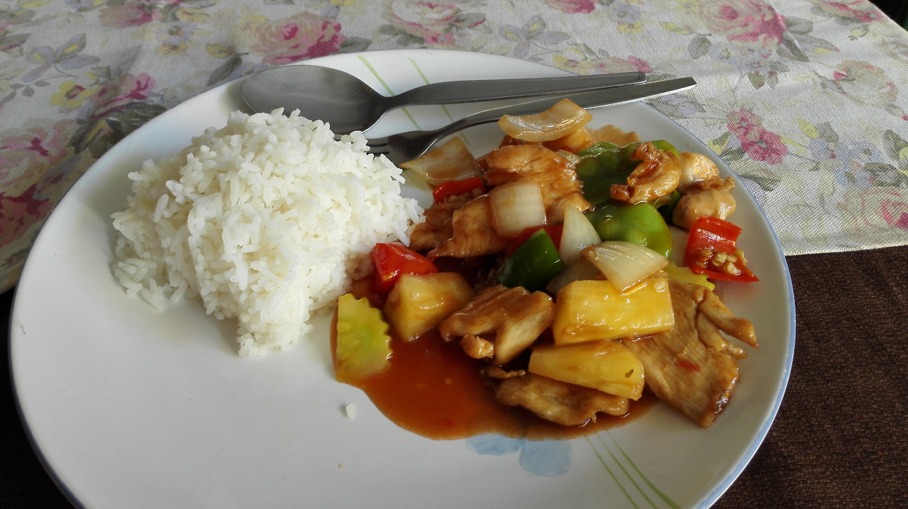 # 님만해민에서 먹은 닭고기 탕수육과 밥. 레스토랑 같은 곳치고는 저렴했던데다 맛도 괜찮았던 곳. 무엇보다 시원한 에어콘 바람이 좋았던 곳.
