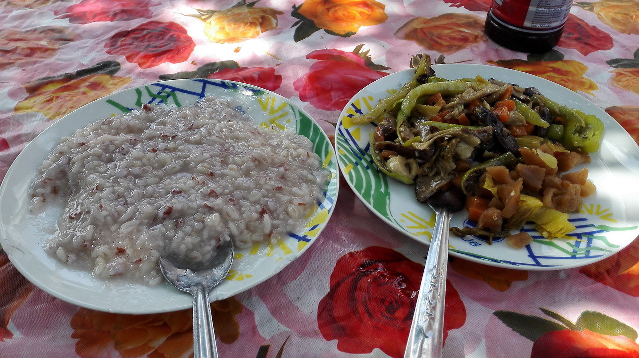 # 왓포 안에서 먹은 죽과 야채. 맛은 그닥이지만 너무 배가 고파서 먹었다.