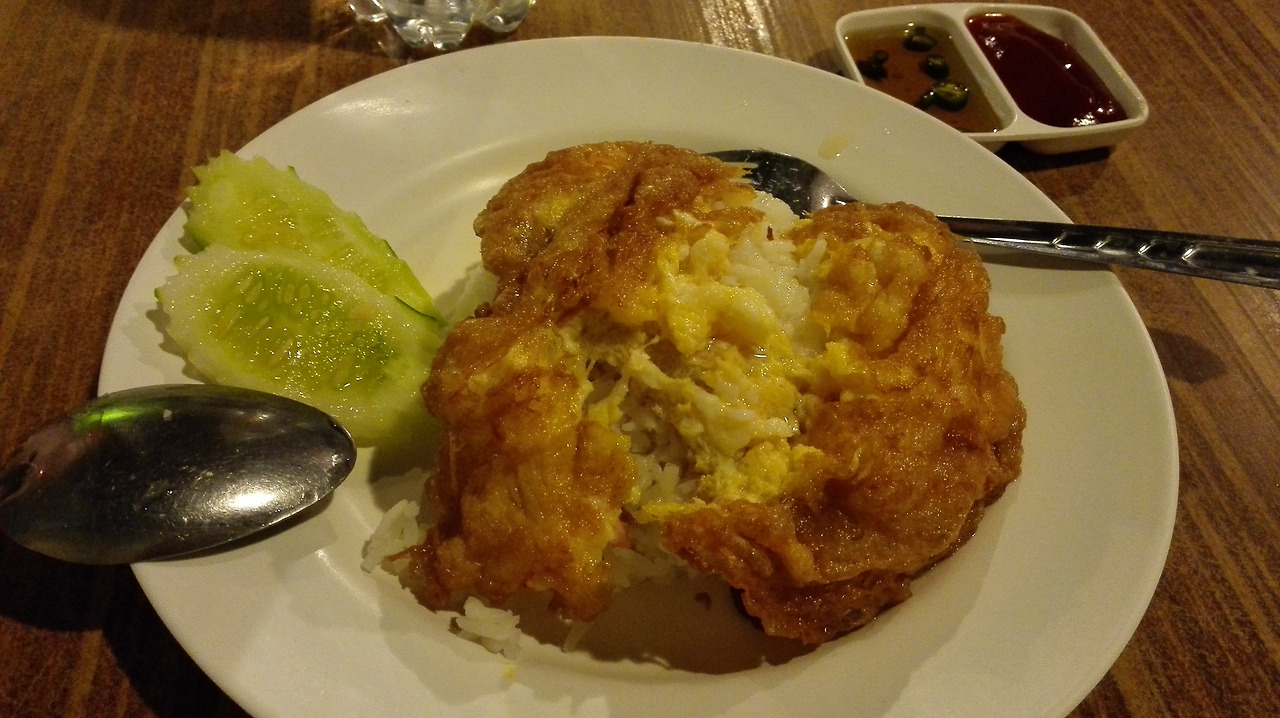 # 역시 야시장에서 먹은 계란 덮밥. 돼지고기를 갈아서 볶은 것이 곁들어져 있다.