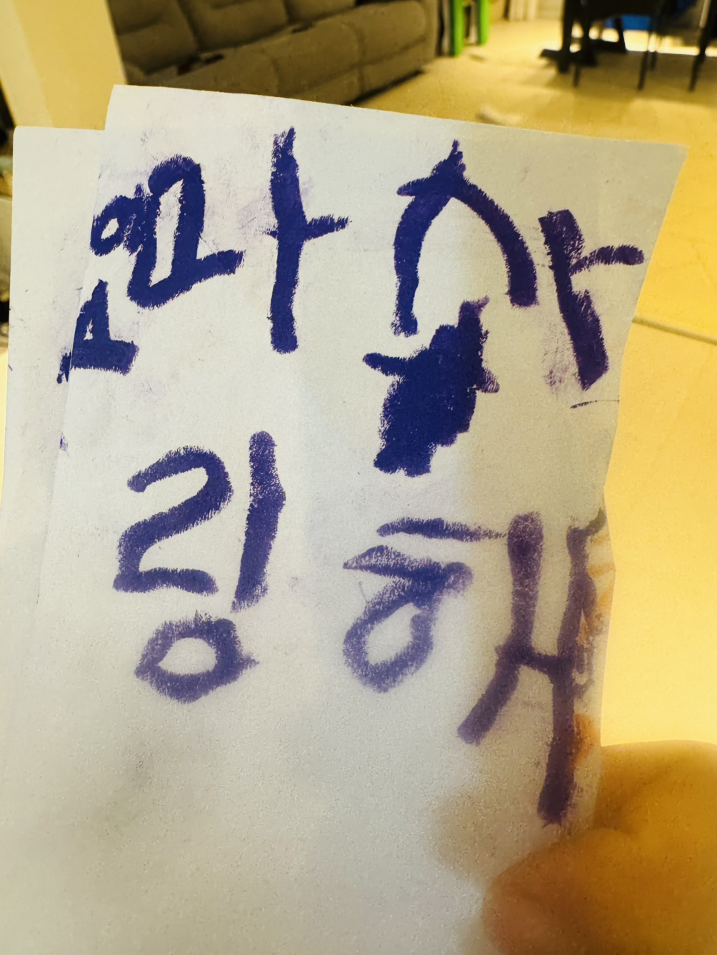 잠시 후 혼자 거실로 나가서 스케치북을 찾아온다. “엄마, 나 글씨 쓸게 있는데 좀만 도와줄 수 있어? “라고 묻는다. 무슨 글자를 쓰고 싶은지 묻자, “불러만 줘. 내가 써볼게~ ” 라면서 아는 글씨는 알려주지 않아도 된다며 자신만만이다.