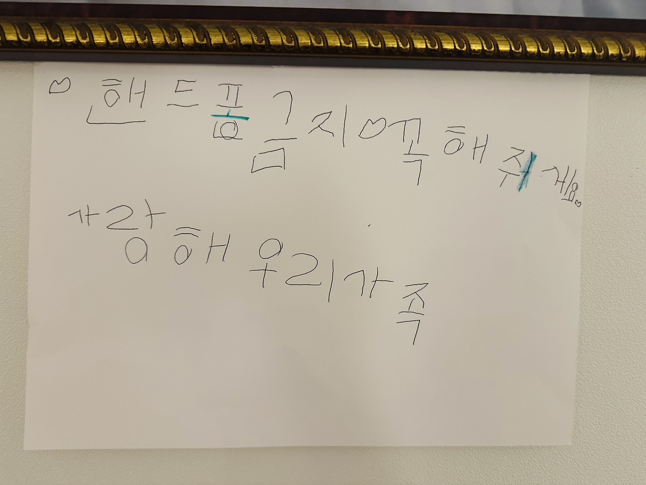 핸드폰 하던 손을 자연스럽게 내려놓고 이렇게 엄마아빠한테 글로 써줘서 고맙다는 말과 함께 아이를 한번 더 안아주었다. 글의 힘은 대단해서 아이의 짧은 편지를 침실에 붙여 놓으니 요새도 침대에서 핸드폰 안하기를 실천하려고 노력하게 된다.