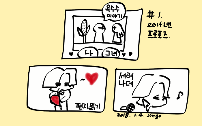나는 매년 아내에게 프러포즈하고 있다. 날짜는 정해지지 않았지만 한해의 어느 날 불쑥 고백한다. 내가 하는 이유는 간단하다. 사랑했던 처음의 감정을 잃고 싶지 않았기 때문이다. 2014년도의 최초 고백 과정을 올리며 나를 되돌아보고자 한다. 프러포즈는 케이크 위의 장식과도 같다. 없으면 밋밋한 느낌이 든다. 있어도 연인에게 뽀로로 인형이나 싫어하는 과일이 꾸며진 케이크를 줄 순 없다. 사랑하는 사람의 감성을 존중하는 프러포즈 장식이 있어야 케이크는 완성된다.