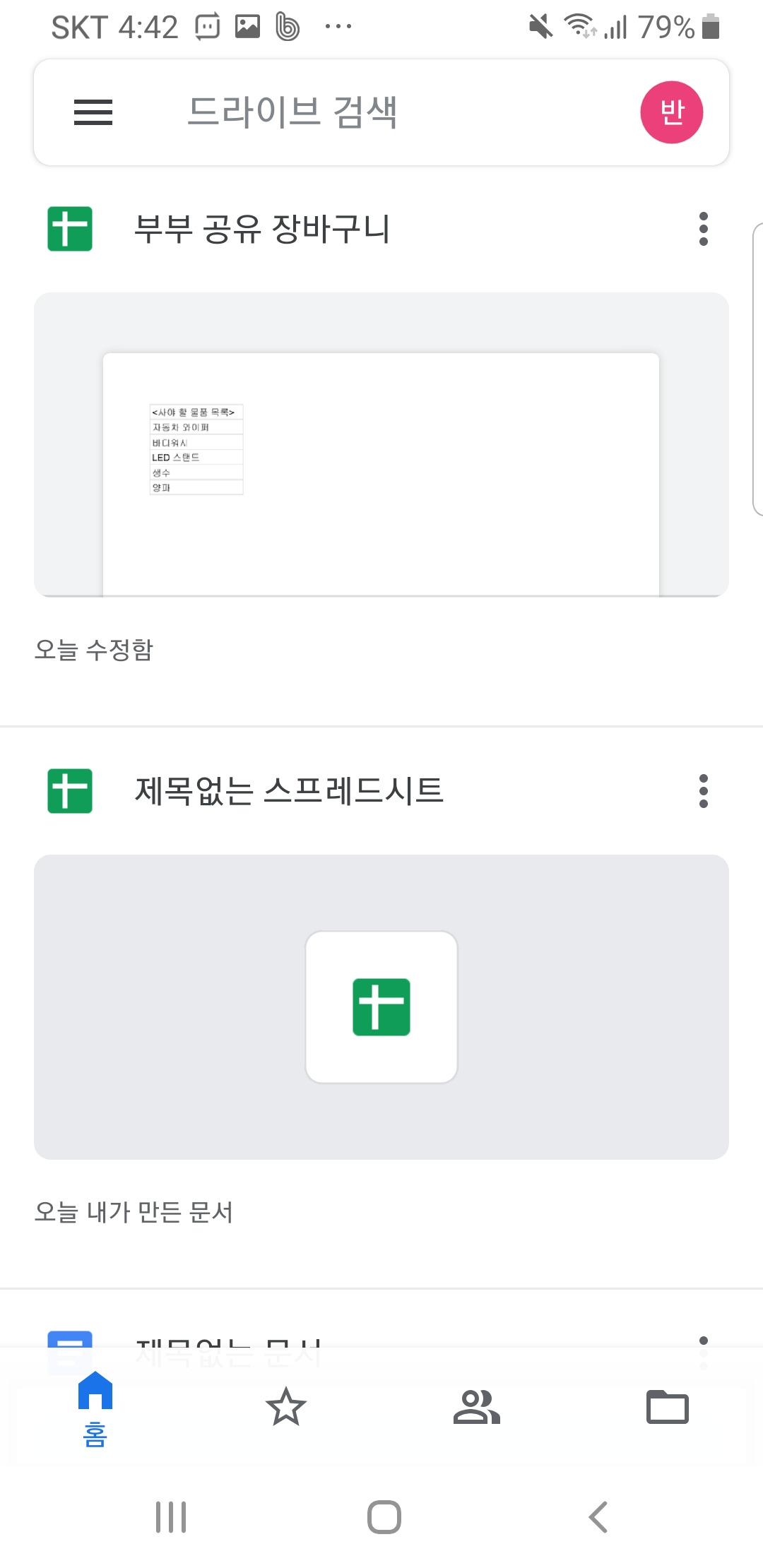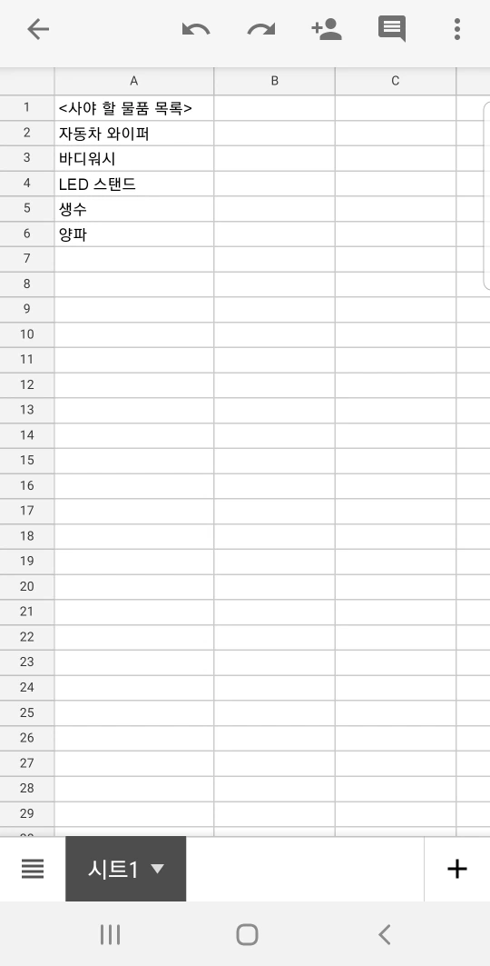 맞벌이 부부의 애환은 장보기에도 있다. 필요한 물건을 사야 하는데 평일에 살 수 있는 시간이 부족하다. 그러다 보면 사야 할 것을 정작 주말이 와도 까먹는 경우가 있다. ‘처음에는 냉장고에 메모지를 붙여두고 서로 생각날 때 적어보자’라고 했지만 사실 1주일 만에 포기했다. 살 것이 생각날 때가 하필이면 냉장고 앞이 아니었다. 그래서 생각한 게 장바구니 리스트 파일을 공유해서 쓰는 것이다. 필요한 것은 ‘구글 드라이브 앱’과 ‘구글 스프레드시트 앱’이다. 보통 구글 드라이브 앱은 기본 앱으로 깔려 있다. 없으면 플레이스토어에서 받으면 된다. 난 PC를 이용하여 만들고 폰에서 편히 쓰고 있다.