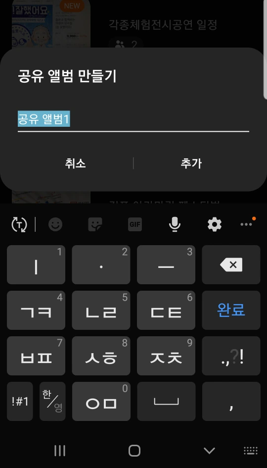 3. 공유를 터치하면 ‘+’ 창이 있다. 터치하면 공유 앨범 만들기가 뜨면서 앨범 이름을 추가하라고 뜬다.
