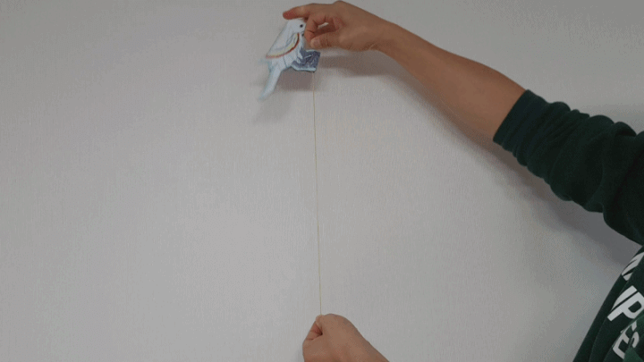 순서 5. 이제 딱따구리 놀이를 할 시간이다. 고무줄을 빨대 사이에 넣고 고무줄을 길게 늘인다. 고무줄 윗부분에 딱따구리를 두면 딱따구리는 힘차게 움직인다.