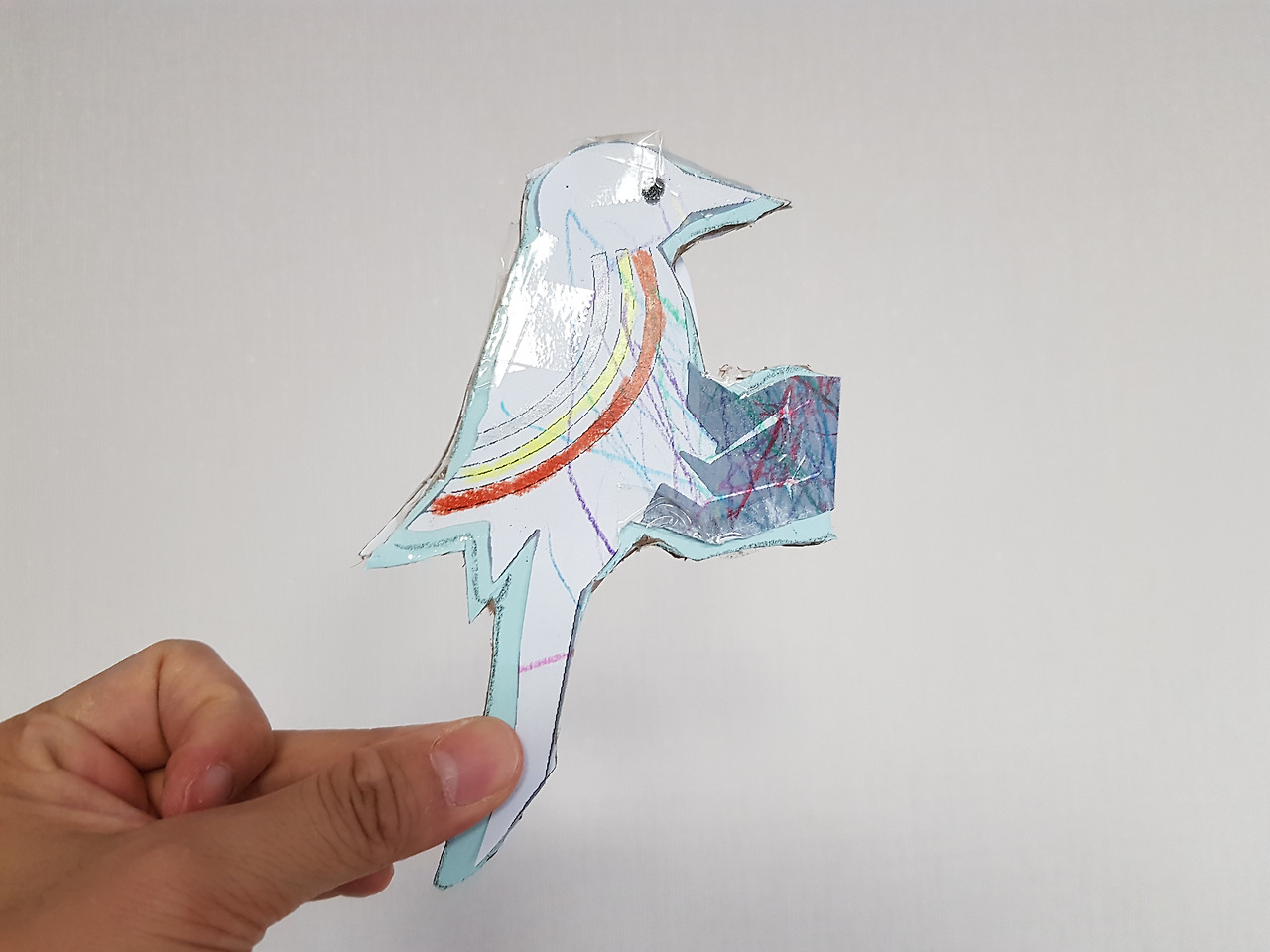 순서 2. 두꺼운 종이에 오린 딱따구리를 붙이고 색연필이나 물감, 스티커 등으로 꾸며준다.