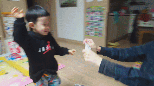 아기에게 태권도의 격파 놀이를 함께 해보았어요. 부모가 화장지를 잡고 아기가 손으로 휘두르면 휴지가 반듯하게 잘립니다. 손보다 발로 하는 것을 더 좋아했습니다. 바로 결과가 보이니 아기가 좋아하고 자신감도 생기더군요. 요즘 공룡을 좋아하면서도 무서워하는데 무서운 공룡이 나타나면 엄마, 아빠를 지켜달라고 부탁했어요.