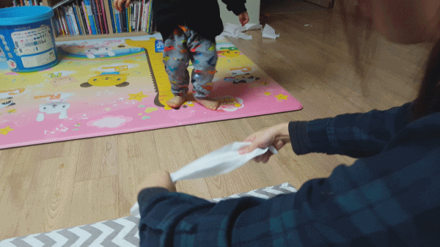 매트가 깔린 곳에서 하는 것이 좋습니다. 아기가 하늘 보느라 넘어질 수도 있어요. 그리고 아빠랑 아기가 모두 하늘에 나는 화장지만 보느라 서로 부딪힐 수 있으니 주의 바랍니다. 과장된 모습으로 엎드려서까지 휴지를 살리려는 노력에 아기가 웃는 법이지요.