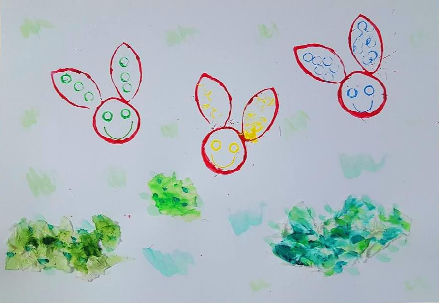 배웠던 휴지 놀이를 적용했습니다. 그리고 토끼의 눈은 볼펜대를 도장 삼아했고 입은 네임펜을 이용했습니다. 시중에 파는 눈 스티커나 눈알을 붙여도 좋은 작품이 될 듯합니다.