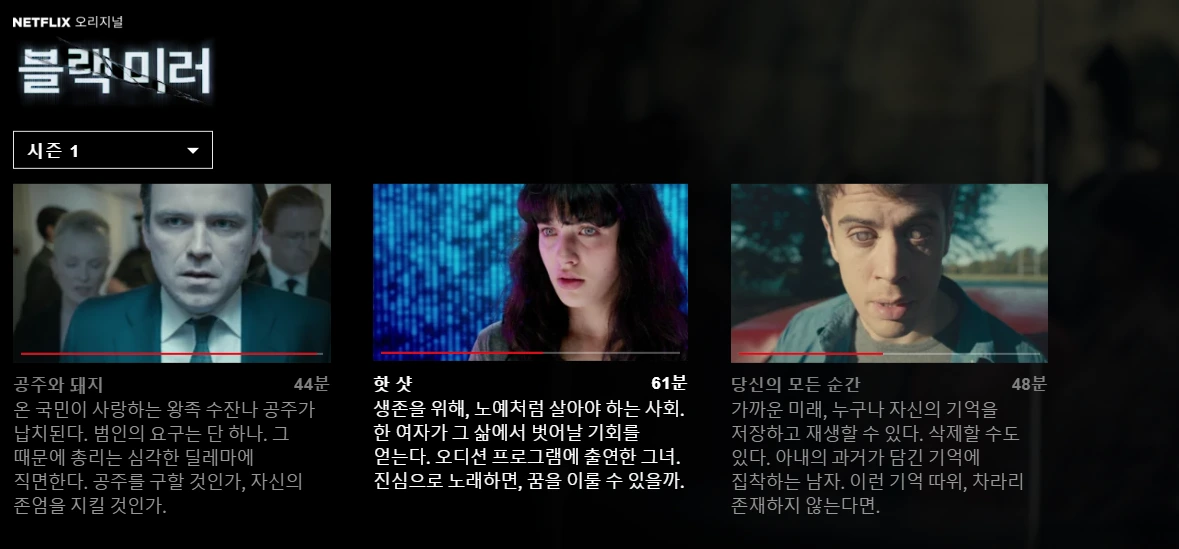 블랙미러는, 과학 기술이 급격하게 발전함에 따라 우리 사회에 미치는 악영향을 소재로 각 편의 에피소드로 이루어진 시리즈이다. 넷플릭스의 수많은 시리즈들과 마찬가지로 비슷한 구성으로 전체를 이끌어가고 있지만 그 가운데에서도 요즘 <블랙미러>가 유독 인기를 끄는 데는 분명 이유가 있을 것이다.