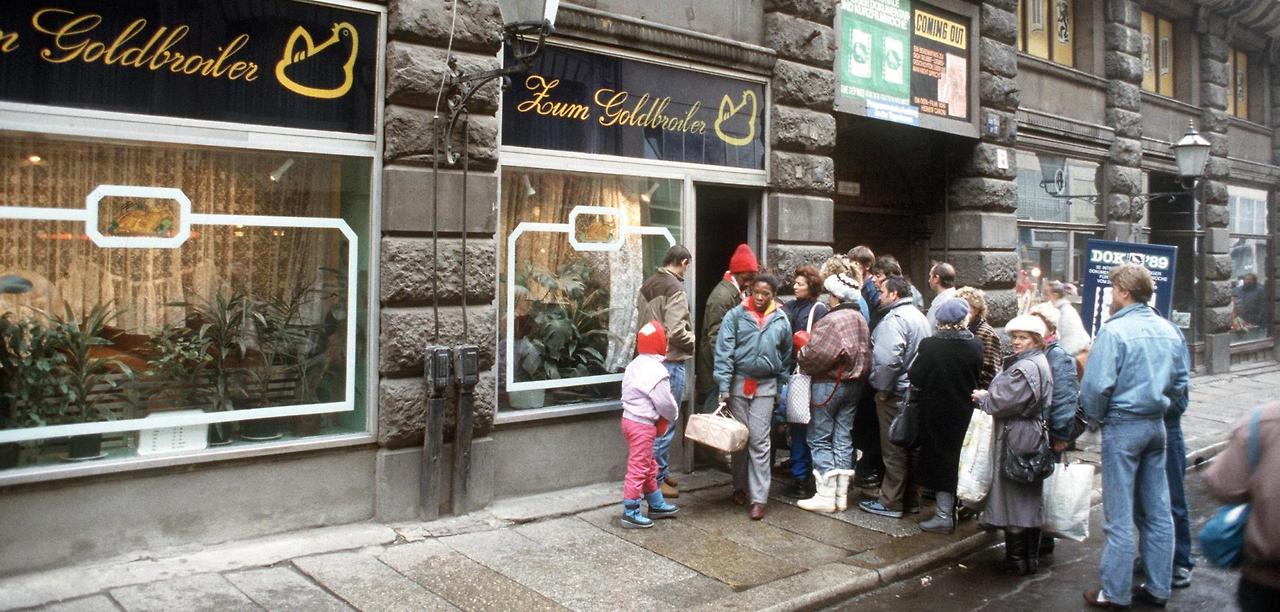 ㅣ동독 시절 라이프치히에 있던 통닭 구이 집 앞에 줄을 서 있는 사람들. 통닭구이를 지칭하는 'Broiler'라는 간판이 보인다 ⓒ picture alliance / dpaㅣ