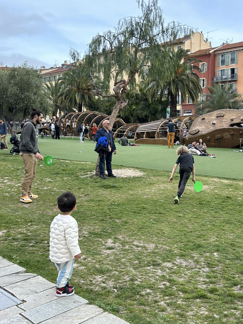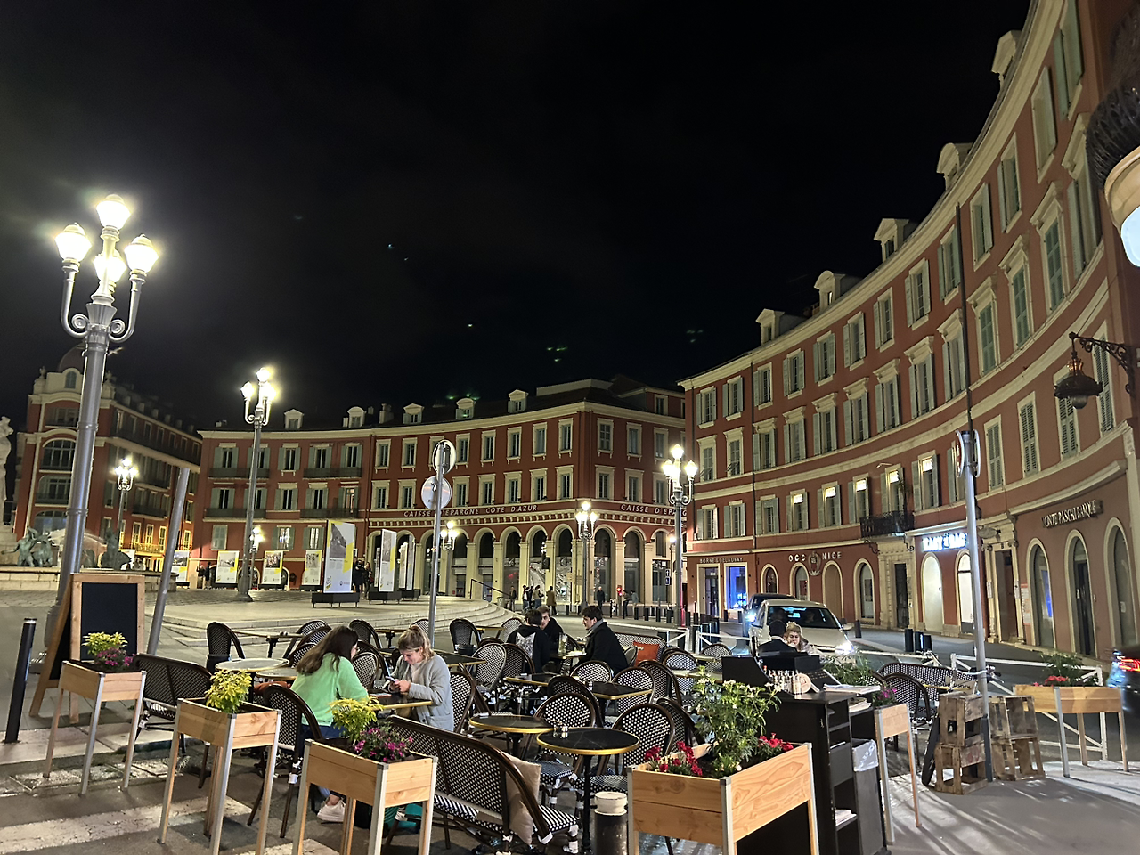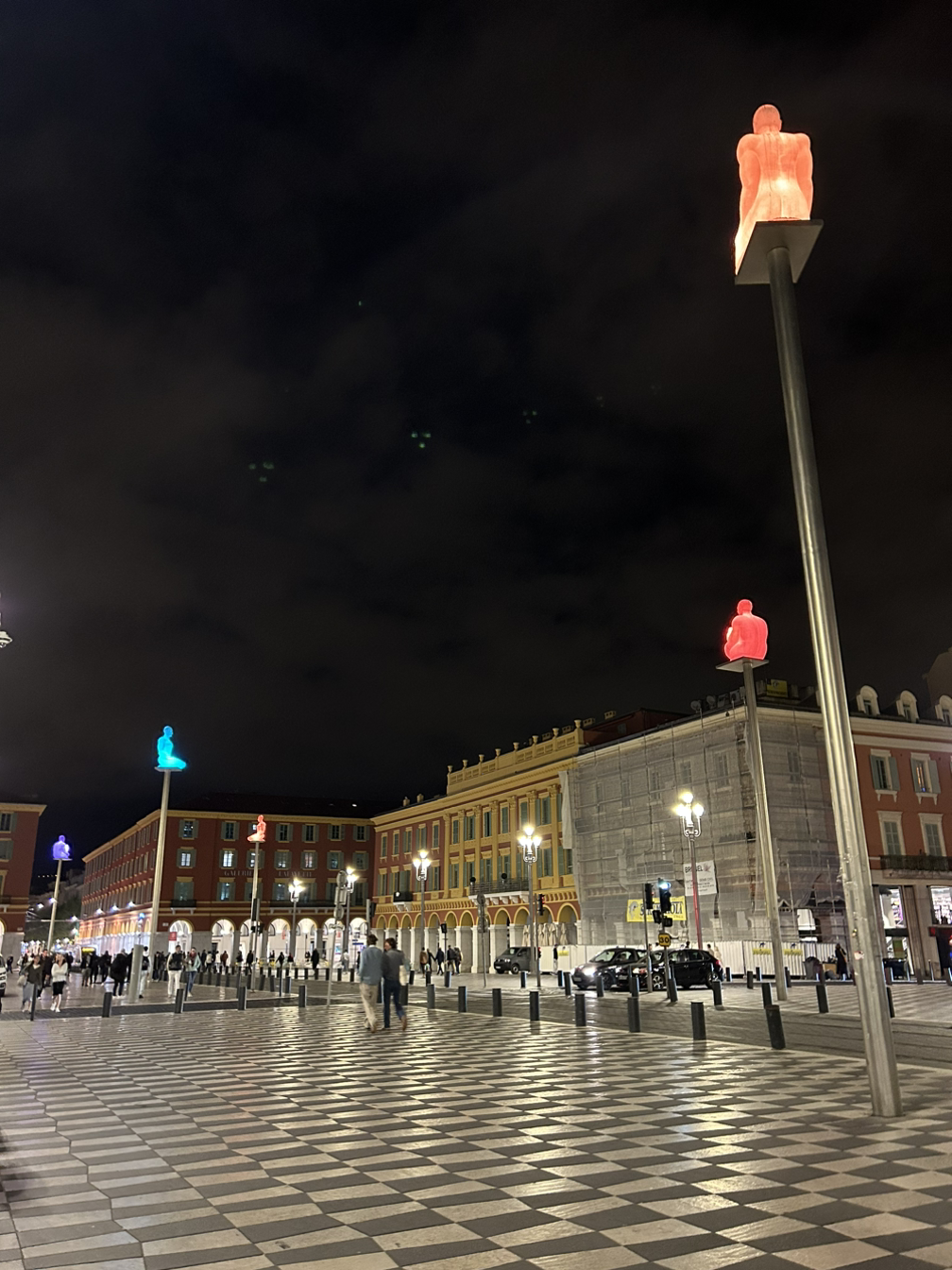 시내에 도착하니 늦은 밤, 아기는 벌써 잠들어 있었고, 우리 부부도 너무나도 지쳤었다. 한국인 여행객들이 있길래 길을 물어봤더니 중간에 정차해서 내려 표를 발권하면 된다고 들어서 그렇게 했던 것이다. 그냥 원래 타던 기차를 탔었으면 시내까지 편하게 이어서 갈 수 있었을 텐데, 중간에 내려 버스를 기다리고 또 숙소까지 가는데 시간이 꽤나 걸렸다. 목적지에 내려 몇 분 걷다 보니 굉장히 큰 광장 Massena square 이 보였다. 바닥이 꼭 체스판 같은 광장에 형형색색으로 빛나는 동상들이 눈을 사로잡았는데, 성인 남자들이 기다란 기둥 위에 앉아있어 같이 다른 색으로 광장을 환히 비추고 있었다. 알고 보니 이 조형물은 스페인 조각가가 만든 니스의 대화 Conversation a Nice라는 작품이라고 한다. 해변으로 갈 때 광장을 매번 지나쳤기에 이 조형물을 매번 지나가면서 보았는데, 독특하면서도 낮과 밤에 주는 다른 매력이 눈길이 가게 만들었다.