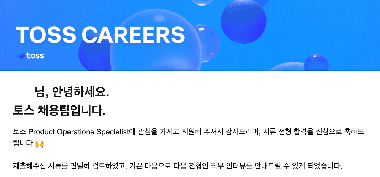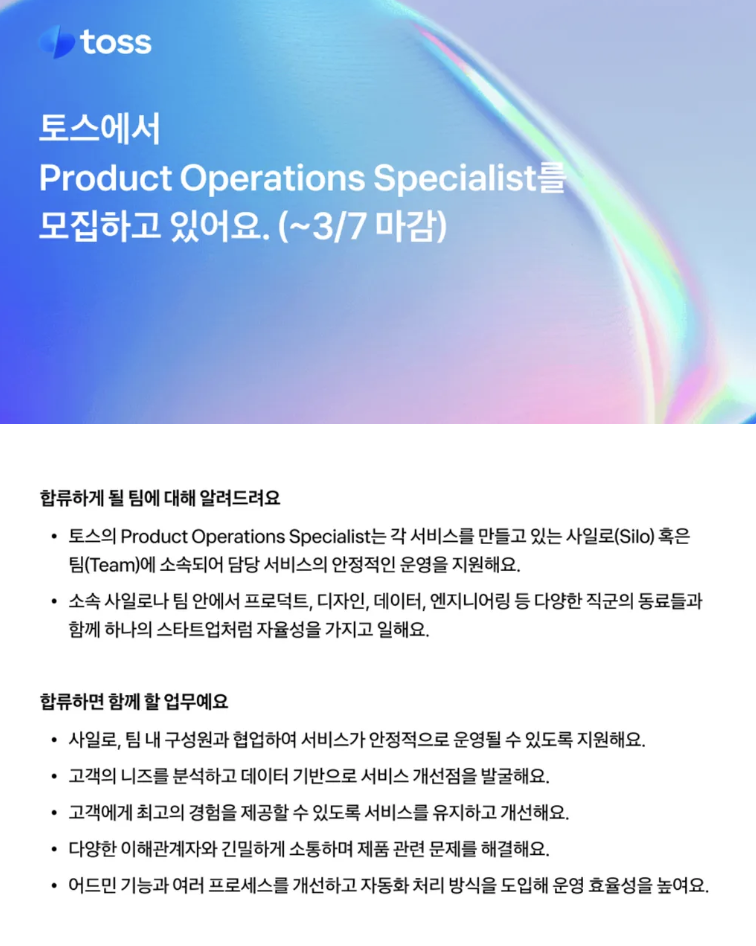 타이밍 좋게도 포트폴리오 업데이트 작업을 딱 마쳐갈 쯤에 토스 Product Operations Specialist(POS) 채용 공고를 보게 됐어요. PM 포지션을 우선으로 알아보고 있었지만 운영 쪽으로도 관심이 많았고, 미니 PM으로 알려진만큼 해볼 수 있는 게 많을 것 같아 망설임 없이 지원했습니다.