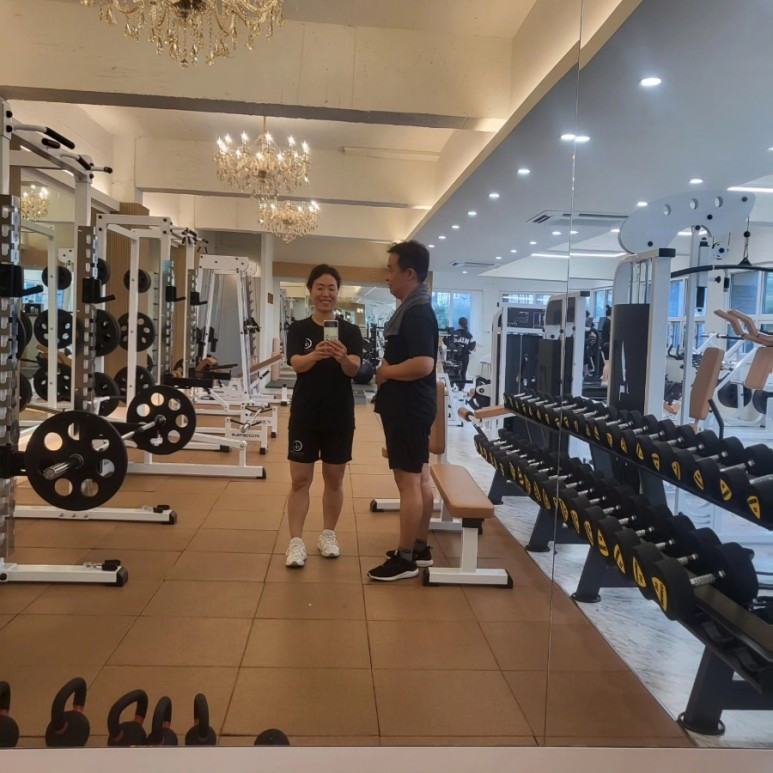 요즘 우리는 함께 헬스를 하고 있다. PT 받는 날은 서로 힘들어서 신경을 못 쓴다. 저 멀리서 남편의 비명소리를 들으며 잘하고 있구나 생각한다. 오늘은 자유운동을 하는 날이다. 남편이 졸졸 따라온다. 귀여워서 핸드폰을 가져왔더니 뱃살이 빠졌다고 한다. 사진을 찍어줬다.