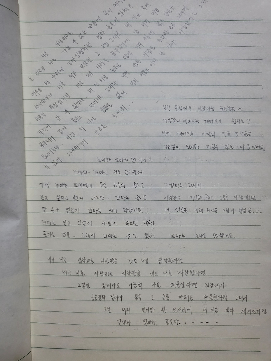 그런 마음을 일기장에 적었다. 한쪽 면에 있는 아름다운 문구들에 마음을 뺏겼다. 사랑 시들을 읽으며 한없이 설레는 마음을 달랬다. 현실 속 사랑은 힘들지만 시를 읽는 순간만큼은 내가 주인공이었다.