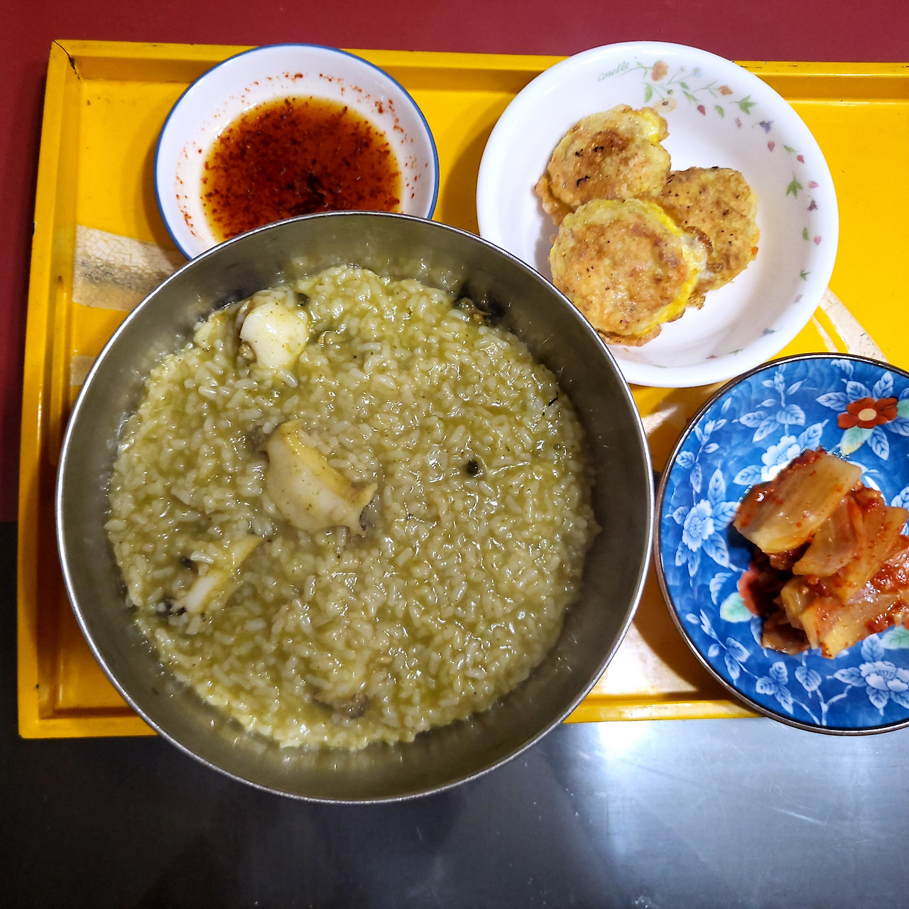 그때쯤 엄마는 김이 폴폴 나는 하얀 죽과 간장종지를 스댕차판에 담고 들어왔다. 심심하고 꾸덕하고 폴폴 잘 끓인 죽이 맛있었다. 간장을 떠서 죽 위에 살살 뿌려 같이 먹다 보면 바닥이 보인다. 바닥까지 박박 긁어먹으면 엄마가 잘했다며 웃었다.
