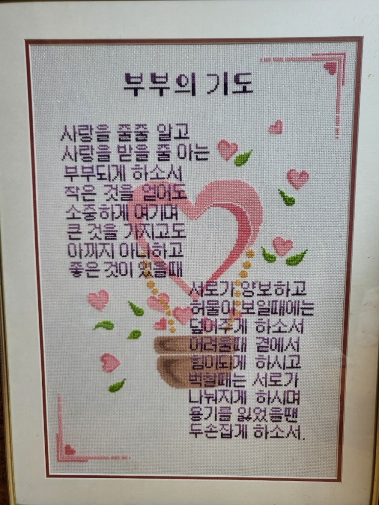 동생은 매일 밤 잠도 안 자고 침침한 조명 아래서 십자수로 액자를 만들었다. 언니의 결혼생활이 행복하길 바라며 새겨 넣은 동생의 마음은 그 어떤 선물보다 소중하고 기뻤다.