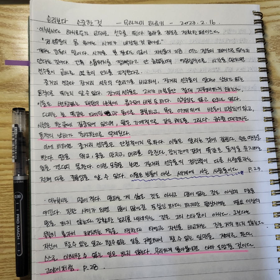 그가 어딘가에서 나이를 먹는 사이 나도 중년의 여자가 됐다. 조금 말랑해졌다. 달릴 때마다 누군가를 의식하던 열여섯 살이 아니라 매일 꾸준히 달리며 글을 쓴다는 것이 얼마나 어려운 일인지를 아는 어른이 되었다. 그리고 하루키의 달리기 에세이를 읽을 수 있는 마음의 여유가 생겼다.