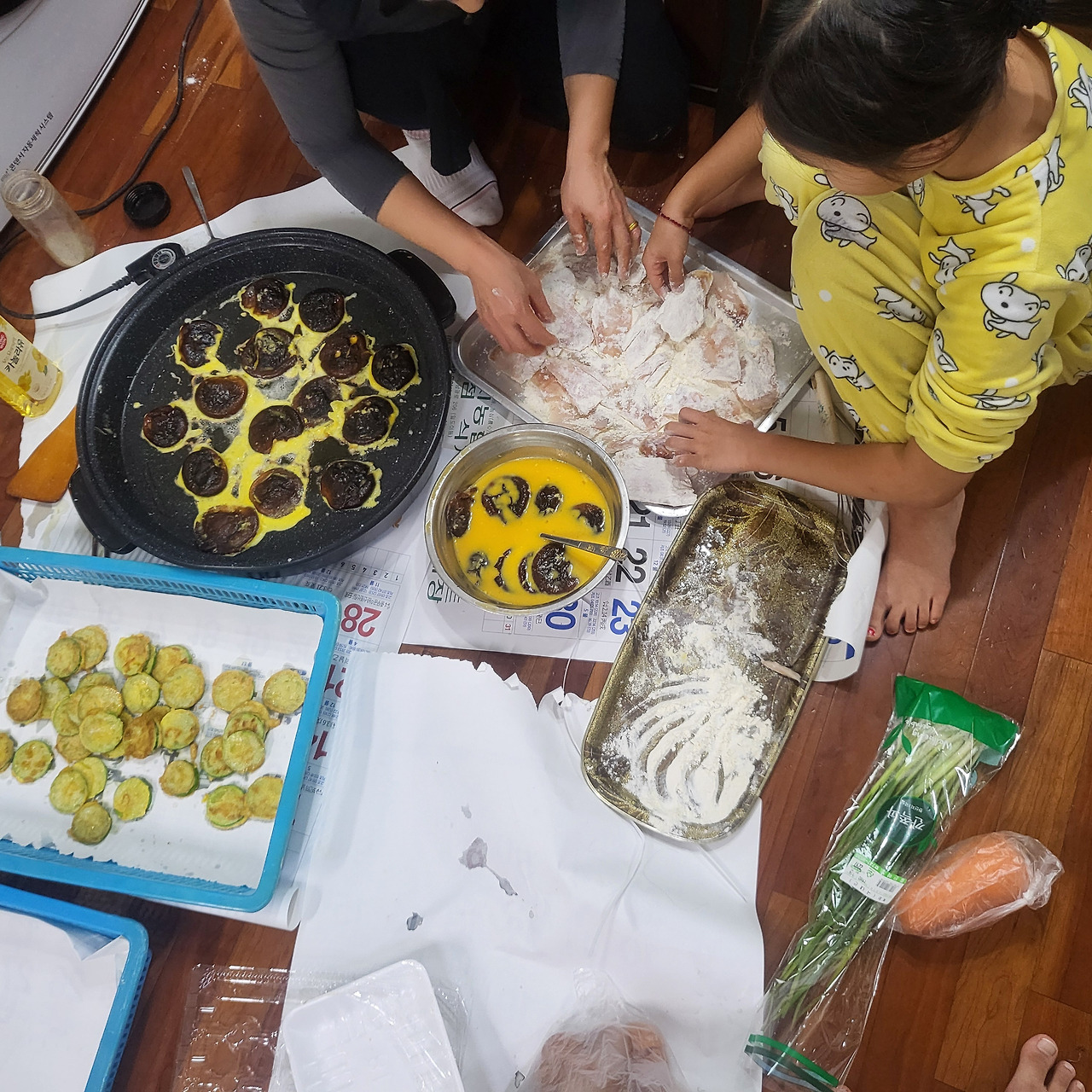세뱃돈을 준비하고, 명절음식을 만들다 보면 제법 흥이 납니다. 막내며느리인 저는 전과 생선담당입니다. 하루종일 전을 부쳐서 큰 형님댁에 가져갑니다. 예전에 아이들이 어렸을 때는 옆에 오지 말라고 했습니다. 알다시피 어린아이들이 도와준다고 해도 그게 다 엄마의 짐이 되니까요. 그런데 아이들이 크면서 상황이 달라졌습니다. 이제는 제법 아이들도 한몫을 합니다. 계란을 풀고, 애호박에 밀가루를 묻히고, 표고버섯에 참기름과 소금을 바릅니다. 올해 저는 세 명의 조수를 부렸습니다. 남편은? 물론 당연히 소파에 앉아 계십니다.