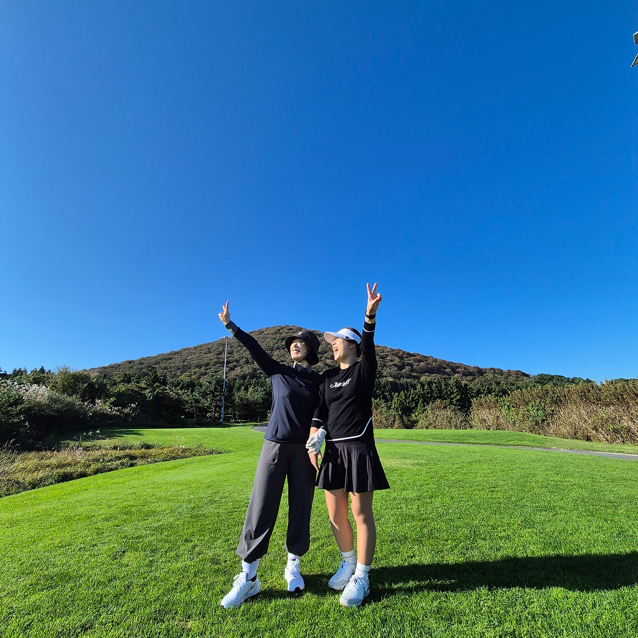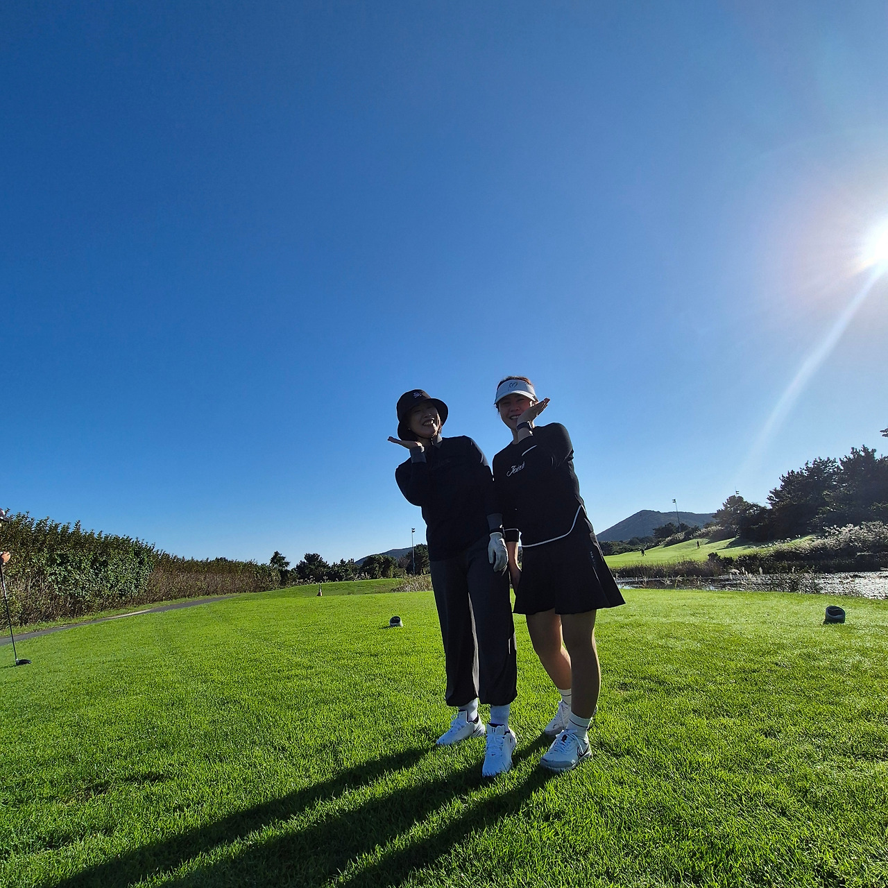 캐디언니가 기다리는 동안 사진이나 찍자고 했다. 사진을 먼저 찍어주겠다고 말하는 캐디언니는 처음이었다. 우리 보고 서 있기만 하면 모델포스로 만들어준다고 큰소리치길래 긴가민가 했는데, 사진을 보는 순간 입이 쫙 벌어졌다. 스노앱 없이 다리가 길어지고, 얼굴이 작아지는 마법을 부렸다. 이 분은 찐이구나. 싶어서 담부터는 캐디언니말에 복종했다. 덕분에 예쁜 사진을 건져서 기분이 좋았다.