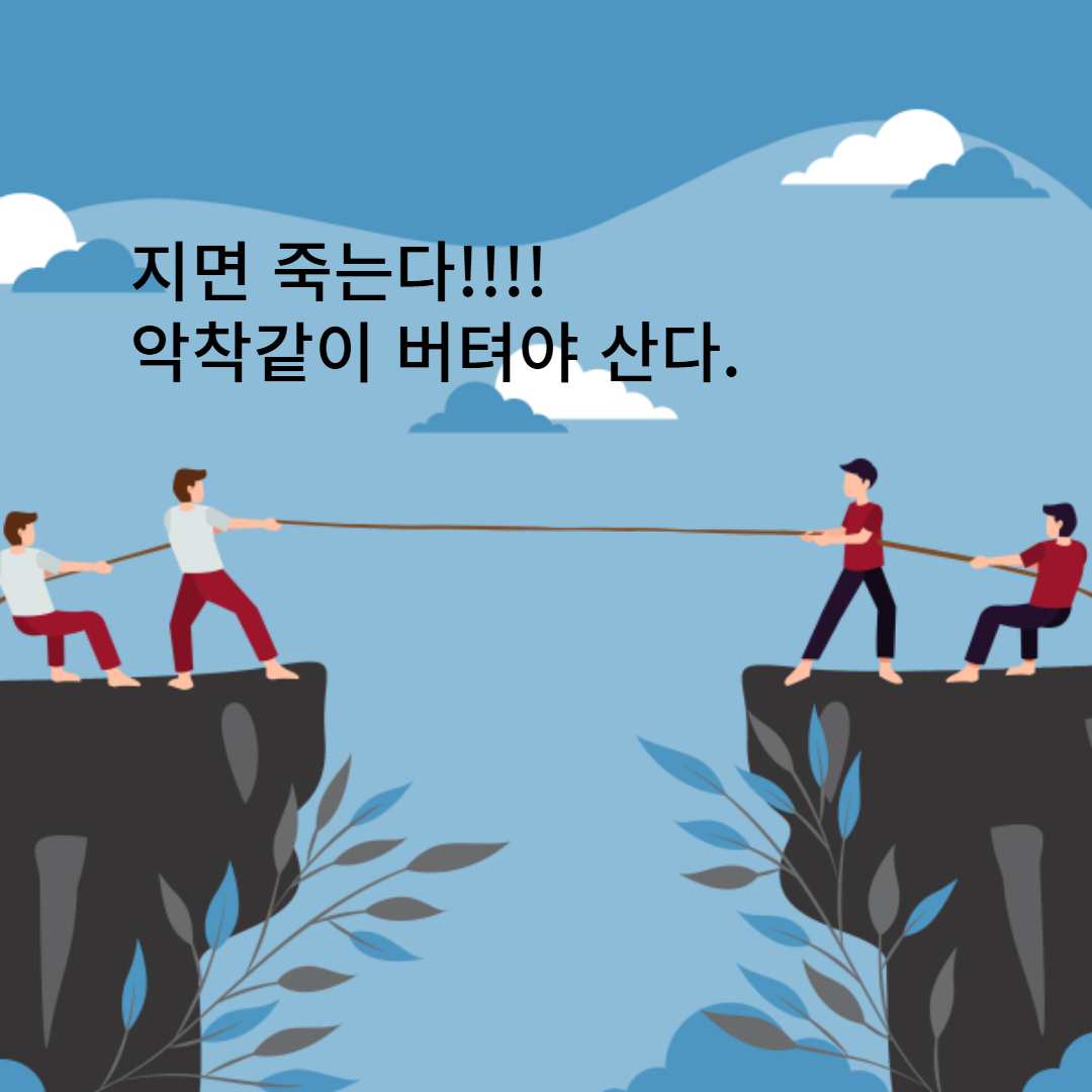 나라는 운동장에서 비슷한 힘을 가진 생각 두 개가 팽팽한 힘대결을 벌이고 있었다. 해야 돼. 하고 싶어 와 못 해. 내가 어떻게. 가 싸운다. 치열하게 박 터지게. 온 힘을 다해.