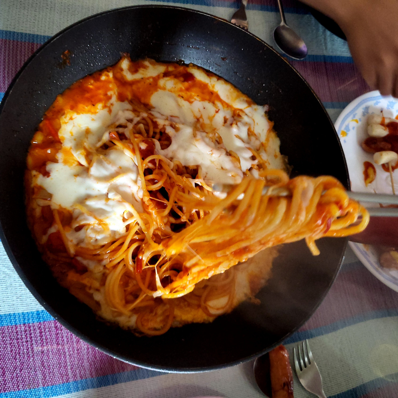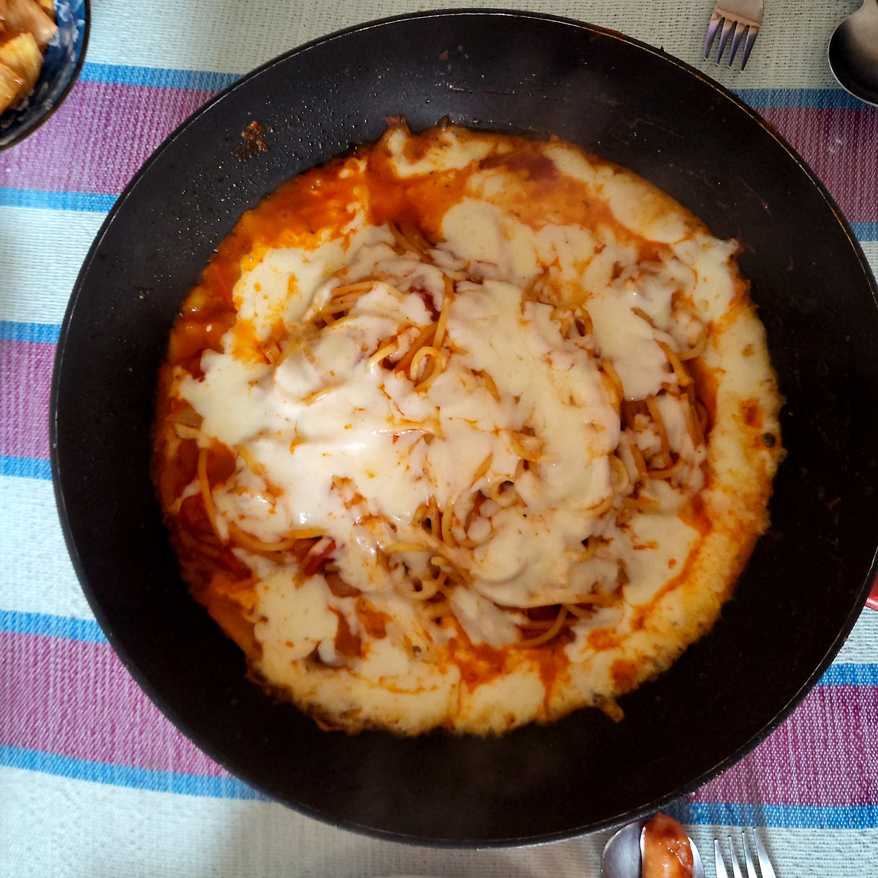 기름에 볶다가 토마토가 묽어질 때쯤 소스를 넣고 보글보글 끓이면 삶은 면을 넣는다. 골고루 젓는다. 냉동실에서 치즈 두 봉을 꺼내고 탁탁 쳐서 뭉친 것을 푼다. 스파게티 위에 골고루 뿌리고 불을 줄인다. 뚜껑을 덮고 치즈가 녹을 때까지 기다린다. 옆에서는 소떡소떡이 익어가고 있다.
