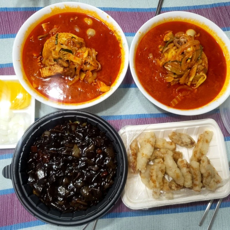 아침밥을 먹은 지 5시간이 지나자 배고프다고 노래를 부르는 아이들. 아빠와 큰 딸이 짬뽕을 외치자 아들과 막둥이가 떡볶이로 맞받아쳤다. 큰 딸과 막둥이가 대표로 가위바위보를 했다. 큰 딸이 세 번 연속 이겼다. 아무리 막둥이가 예뻐도 편을 들어줄 수 없는 상황이다. 비 오는 날 일요일 점심으로 해물짬뽕 와 탕수육세트와 짜장곱빼기를 시켰다.