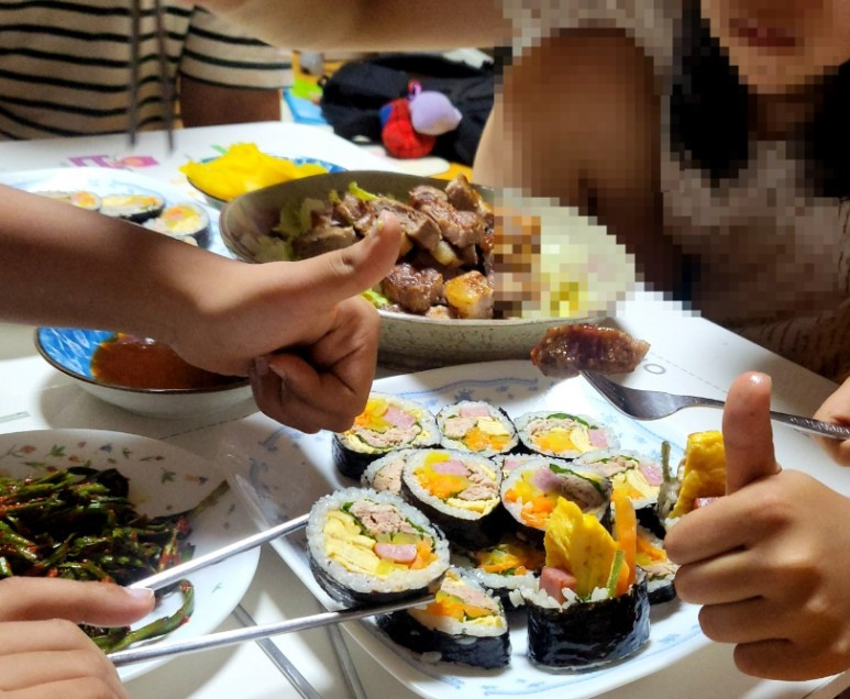 김밥집에서 파는 참치김밥의 두 배 정도는 많이 들어간 참치마요네즈. 고소하고 담백했다. 계란지단을 두껍게 만든다. 김밥 속에 들어가는 계란이 크고 두꺼우면 김밥이 부드럽다. 햄을 싫어하는 막둥이가 김밥 하나에는 햄을 빼 달라고 했는데 까먹었다. 쿨하게 괜찮다고 말하는 막둥이다.