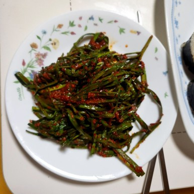 어제 어머님이 부추를 한 아름 캐고 씻어서 주셨다. 얼떨결에 부추김치를 했다. 하룻밤 새 잘 익은 부추김치를 꺼냈더니 김밥하고 제법 어울렸다.