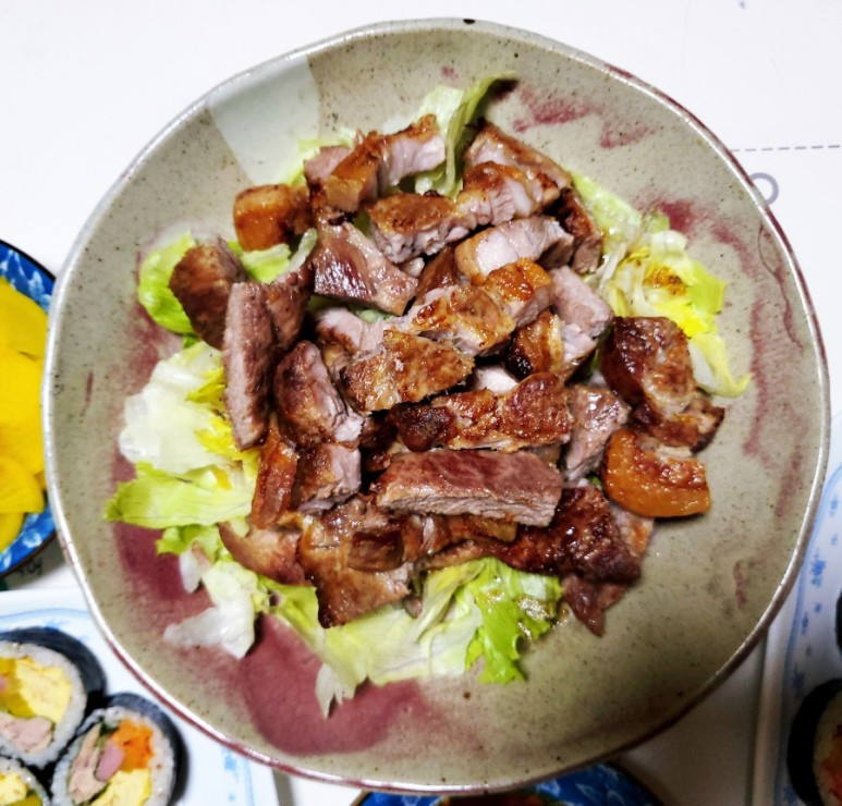 목살스테이크와 참치김밥의 환상적 조화