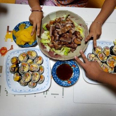조촐하지만 풍성한 저녁밥상이 차려졌다. 요즘 우리 가족은 아이들 방에서 저녁을 먹는다. 하루 종일 에어컨을 켜서 우리 집에서 제일 시원한 곳이다. 다섯 식구가 아이들 공부책상에 오손도손 앉아서 먹는다. 상이 작으니 이것저것 차려놓는 것보다 간단하면서 함께 먹을 수 있는 것들 위주로 차리게 된다.