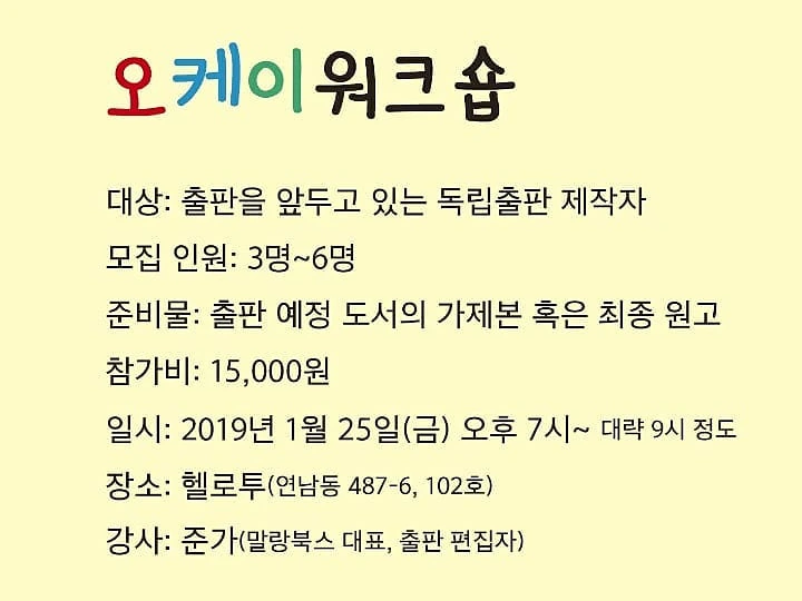 출판직전 최종점검을 같이 한다면 결과물 완성도가 많이 달라질듯한데요 오케이교 워크샵에서는 오랜경력의 편집자이기도 한 말랑북스 대표님이