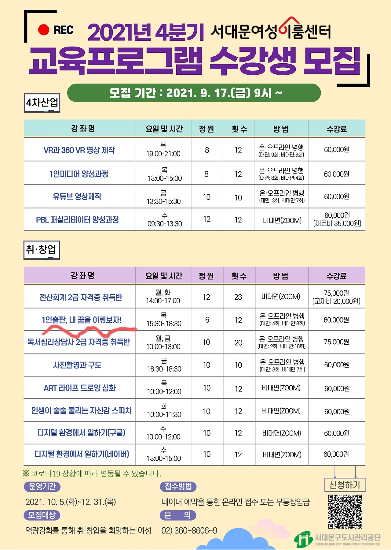 안녕하세요 강경아입니다, 이번 가을부터 겨울까지 서대문여성이룸센터에서 1인 출판 강의를 진행하게 됐습니다.