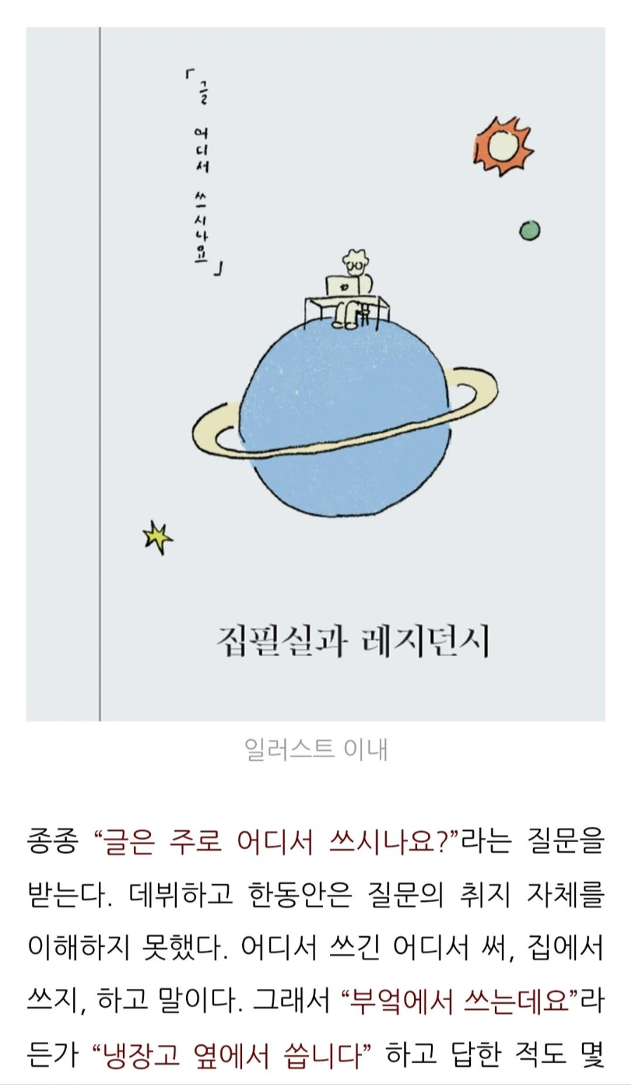 그러던 차에 채널예스에서 이 글을 발견하였다. 부엌에서 혹은 냉장고 옆에서 글을 쓴다고 하는 장강명 작가