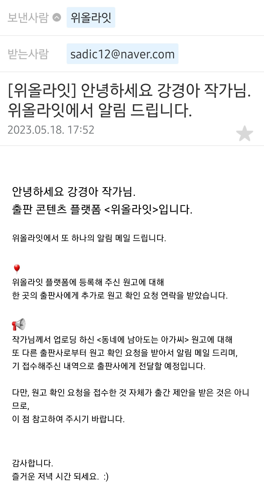 그래 나는 그냥 하는 마음으로 지금껏 버텨온 거 같다. 그런데 내가 성격이 급하다, 것도 매우. 원고요청이 출간제안이 아님을 잘 아는데도 지난주의 나는 메일함을 수시로 열고 닫고를 반복했다. 출간을 하고 싶은 마음을 7년이나 유지하고서도 그냥 기다리지 못하고 초조함을 드러낸 거다.