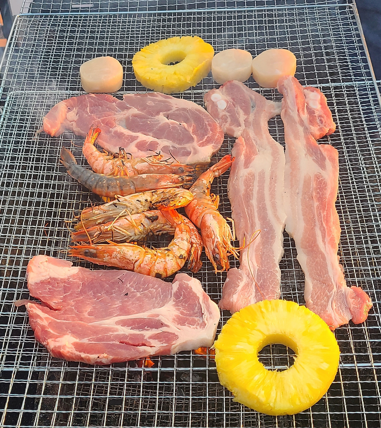 숯불을 피우고 관자, 새우, 프랑크 소시지, 삼겹살, 목살 등을 올립니다. 아빠는 잘 태우시니까 여동생이 집게와 가위를 들었습니다, 저와 엄마는 샤샤삭 야외의 나무 테이블 위에 잽싸게 세팅을 합니다. 식사시간 중간에 꼬맹이 형제 둘이 서로 삐쳐서 네가 있으면 안 먹겠다 실랑이를 했지만 그런대로 6 식구 신나게 바베큐를 잘 먹었습니다. 여동생이 고기를 잘 구워준 덕분입니다, 중간에 고기쌈을 여동생 입에 넣어줬는데 와사비를 좀 많이 넣어줬다고 핀잔을 들었습니다. 힝 ㅎㅎ 식사가 끝나고 교장 선생님 훈화 말씀처럼 아버지의 한차례 말씀이 있으실지 알았는데 엄마와 바로 티브이를 보러 들어가시더군요 ㅎㅎ 이젠 할 잔소리가 바닥났나 봅니다.