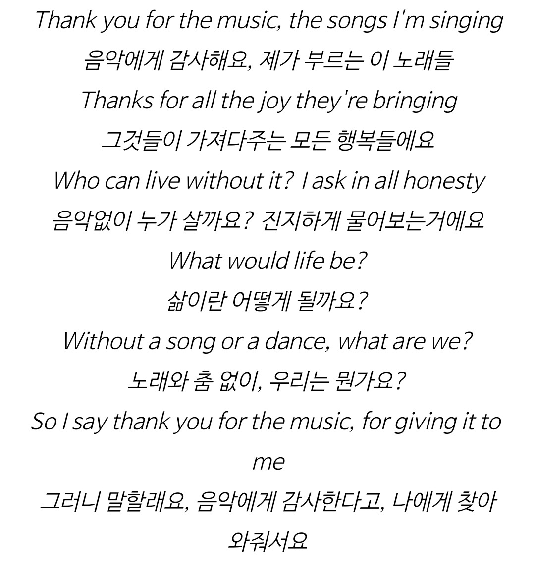 노래와 춤 없이, 우리는 뭔가요, 그러니 말하래요, 음악에게 감사한다고, 나에게 찾아와서요.