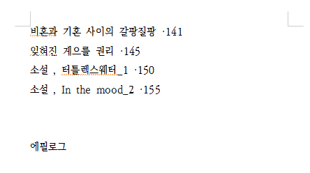 현재 원고 목차 캡처해 왔다. 예전 3월 목차 구성과 현재 구성이 많이 달라져 있다. 가장 큰 차이점은 소설이 중간중간 끼워져 있고 예전 목차 원고에서 빠진 부분이 많다.