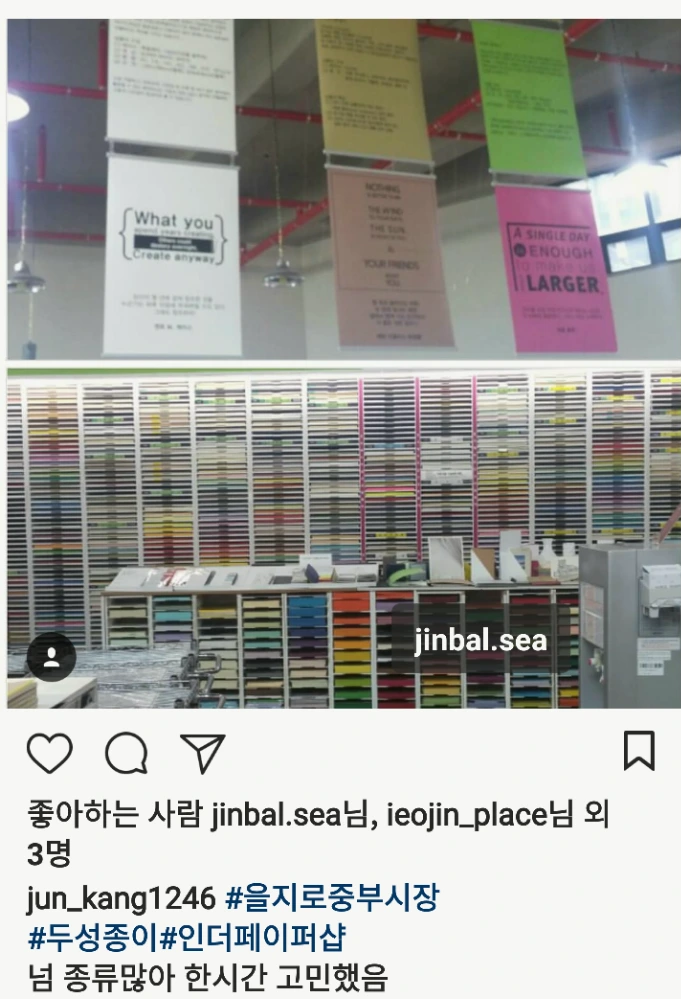 독립출판물에도 손으로 만드는 제본 방식이 있다. 독립출판제작기 매거진 맨 첫 페이지 배경을 보면 세 권의 종이책이 보인다. 그게 다 손으로 제본한 방식이다. 종이 구경도 할 겸 책 안에 들어갈 종이도 고를 겸 을지로 중부시장에 다녀왔다.