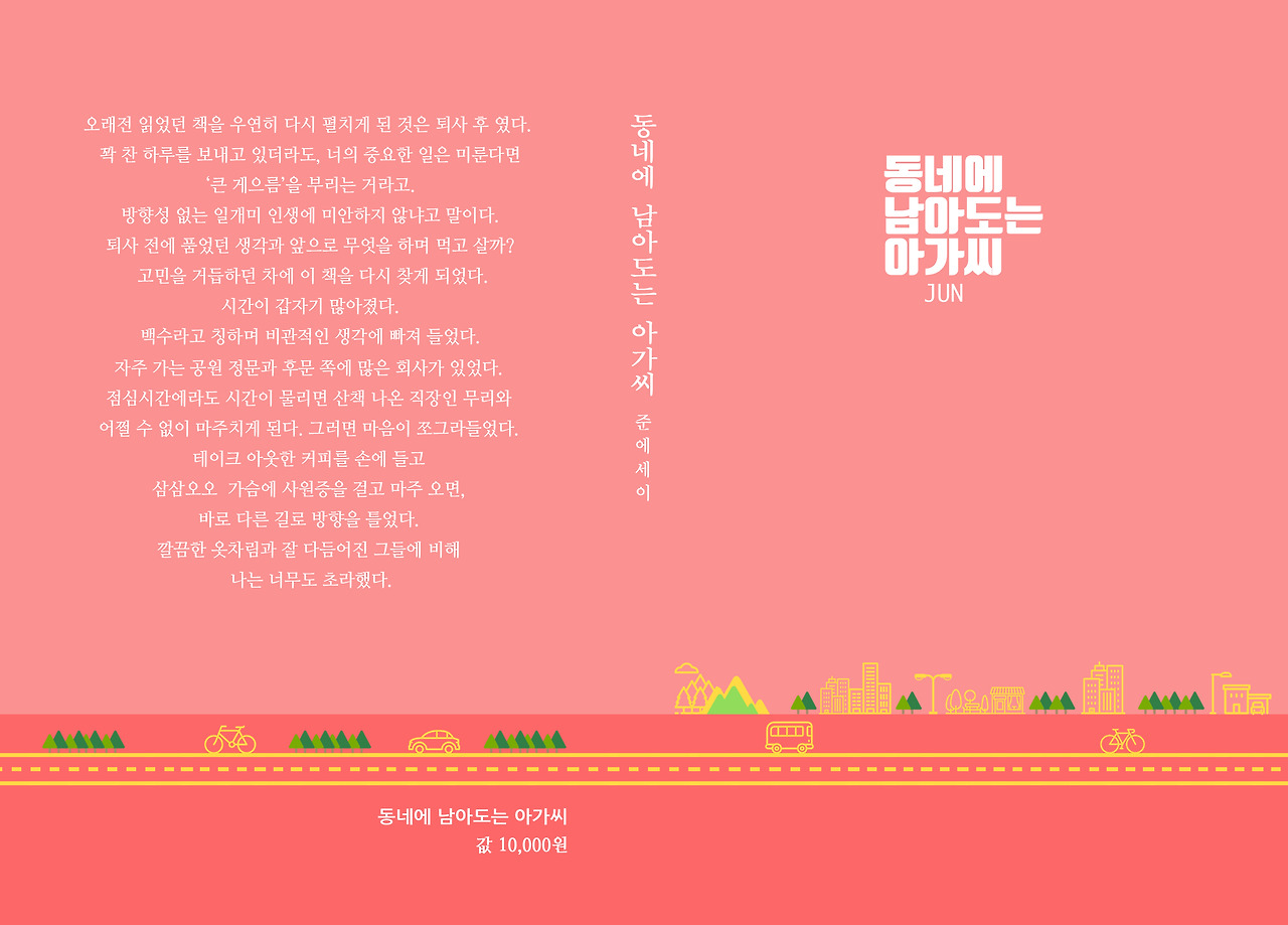 사실 나는 중간에 표지디자이너가 "핑크"를 메인색으로 했을 때 반대했었다. 나는 "녹색"을밀었고 우겼기 때문이다. 하지만 많은 이들에게 피드백을 받은 결과 핑크로 최종 결정했다. 예전에 잡지사에 근무했던 지인이 서점 매대에 무슨색이 눈에 띌까요? 말했다. 아주 결정적인 한방이었다. 현재는 녹색으로 했다면? 아찔하다.