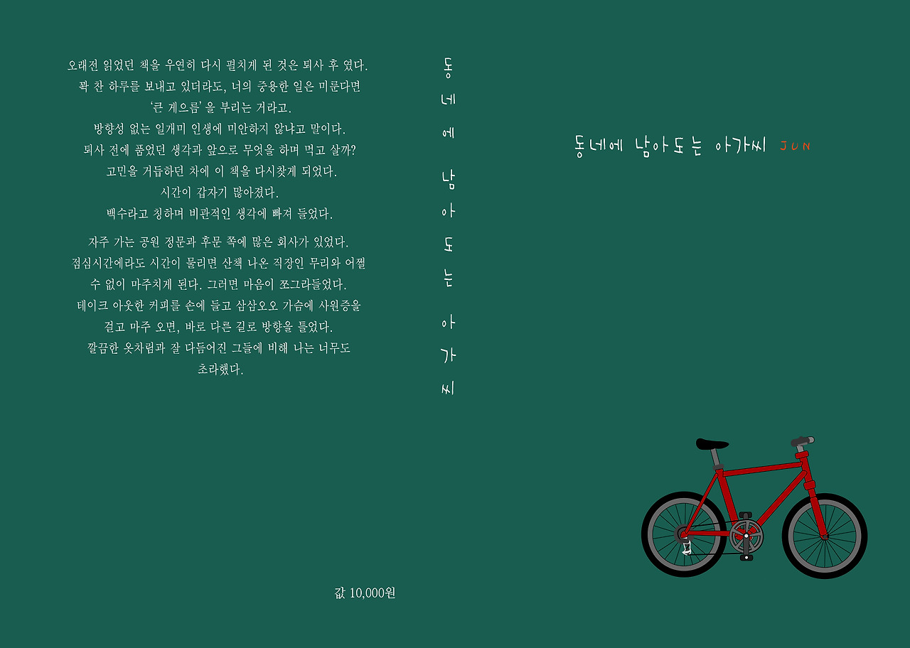 그리고 2번 3번 방법으로 할 때는 경청과 유연함이 필수다. 작가의 영역과 디자이너의 감각과 그 영역은 성격자체가 다르기 때문이다. 포토샵밖에 할 줄 모르던 동생도 점차 눈에 뜨게 좋은 결과물을 내주었기 때문에 감사하고 고맙고 미안하다. 그래서 꼭 책 수익금이 나오기 시작하면 따따블로 챙겨줄거다.