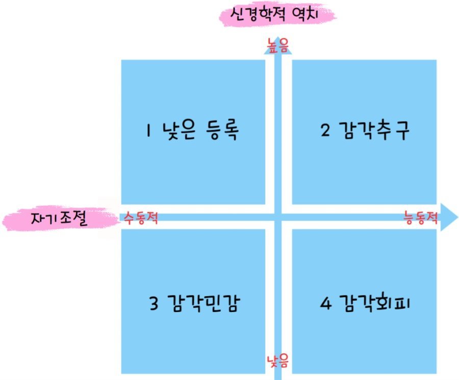 이 2가지 기제에 따라 Dunn이라는 학자는 감각 처리 패턴을 그림과 같은 4가지로 구분했어요. 각각의 예시를 통해 알아볼게요.