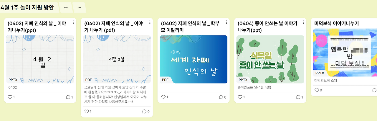 제가 특수교사다 보니까, 짝꿍 선생님(통합학급 교사)께서 처음부터 저한테 수업을 부탁하기는 어려우실 것 같다는 생각이 들었어요. 그래서 제가 먼저 일과 운영도 공유하고 싶다고 말씀드렸어요. 지금 기준으로 말씀드리면, 월, 수, 금은 통합학급 선생님이, 화, 목은 제가 일과를 운영해요. 짝꿍 선생님이 일과를 운영하는 날 다른 교사는 특수 유아를 지원하는 역할이 안정화되어 있어요. 유아들의 놀이 흐름에 알맞은 활동이 떠오르면 구두로 공유하고, 일과 흐름은 패들렛(Padlet)으로 작성해요. 이제는 구두 협의 과정이 생략돼도 전혀 어색하지 않은 사이가 됐어요.