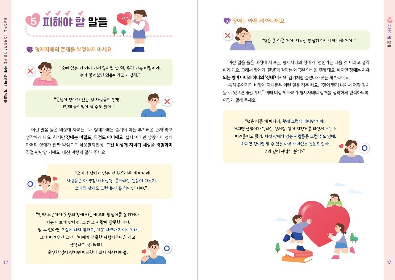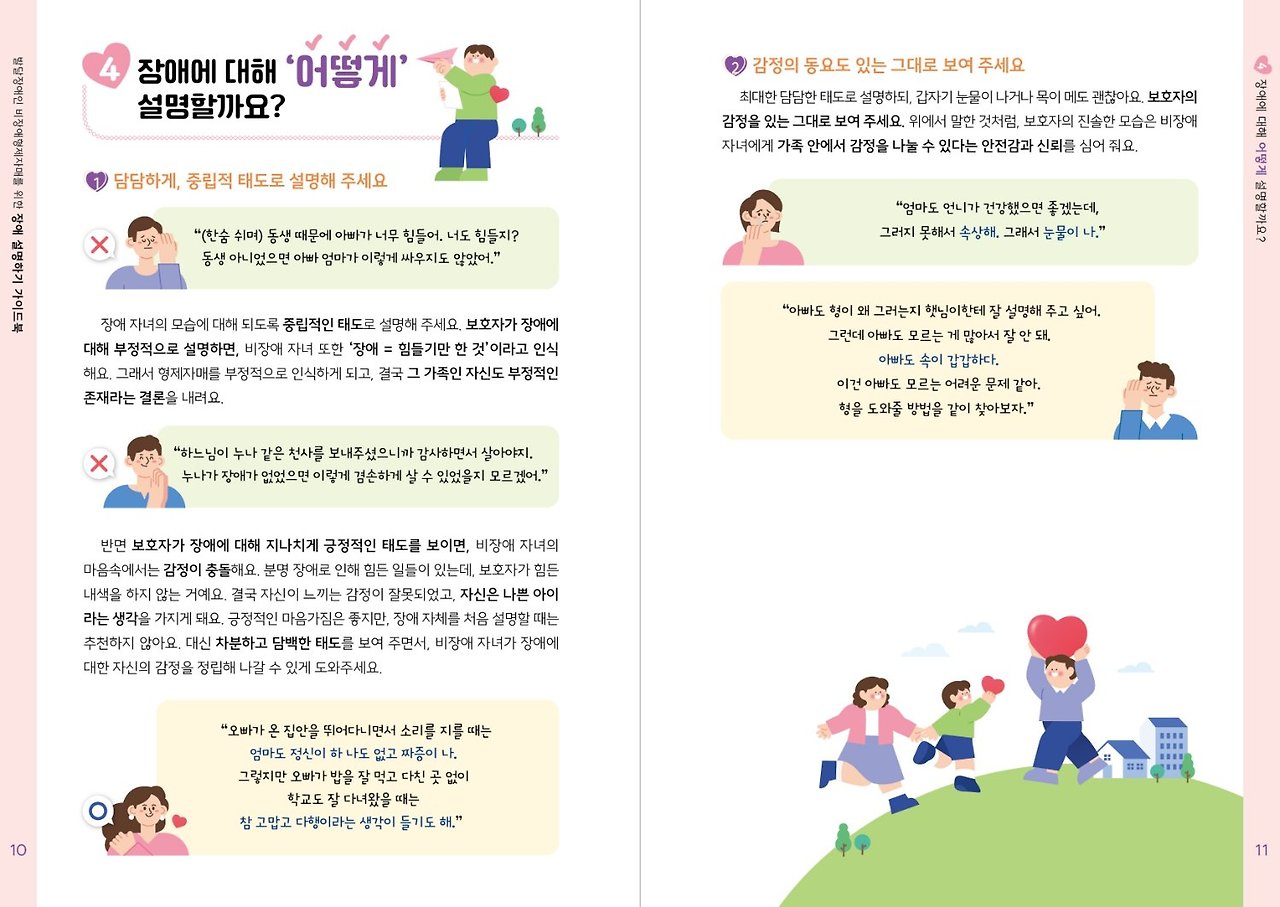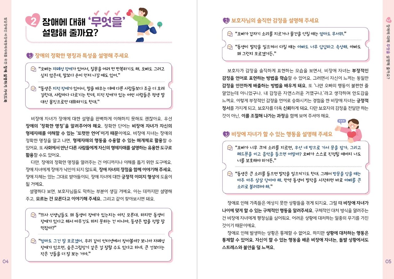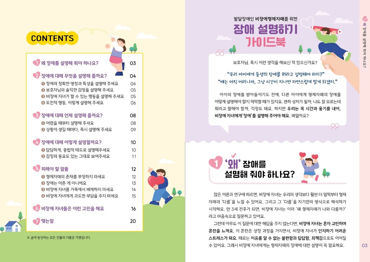 2024년 8월에 뉴닉에 <자녀에게 '장애' 설명하기 가이드>라는 아티클을 쓴 적이 있다. 이 아티클을 기반으로 한국장애인개발원, 강원특별자치도 발달장애인지원센터의 도움으로 <발달장애인 비장애형제자매를 위한 장애 설명하기 가이드북>을 내게 되었다. 장애 자녀가 있는 여러 보호자 분들께 실물 자료가 전달되었지만 브런치스토리에도 PDF로 공유하니, 필요하신 분께 전달되었으면 하는 마음이다.