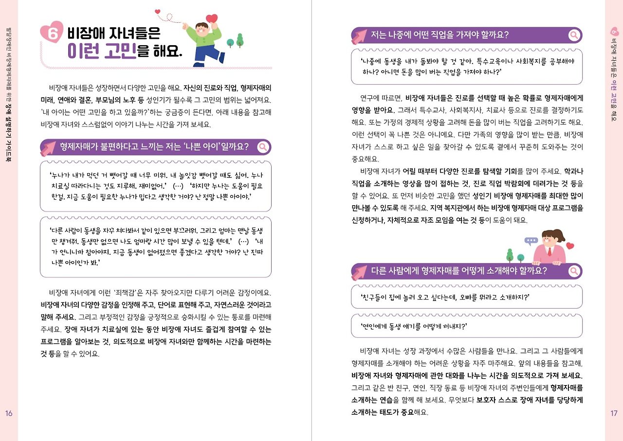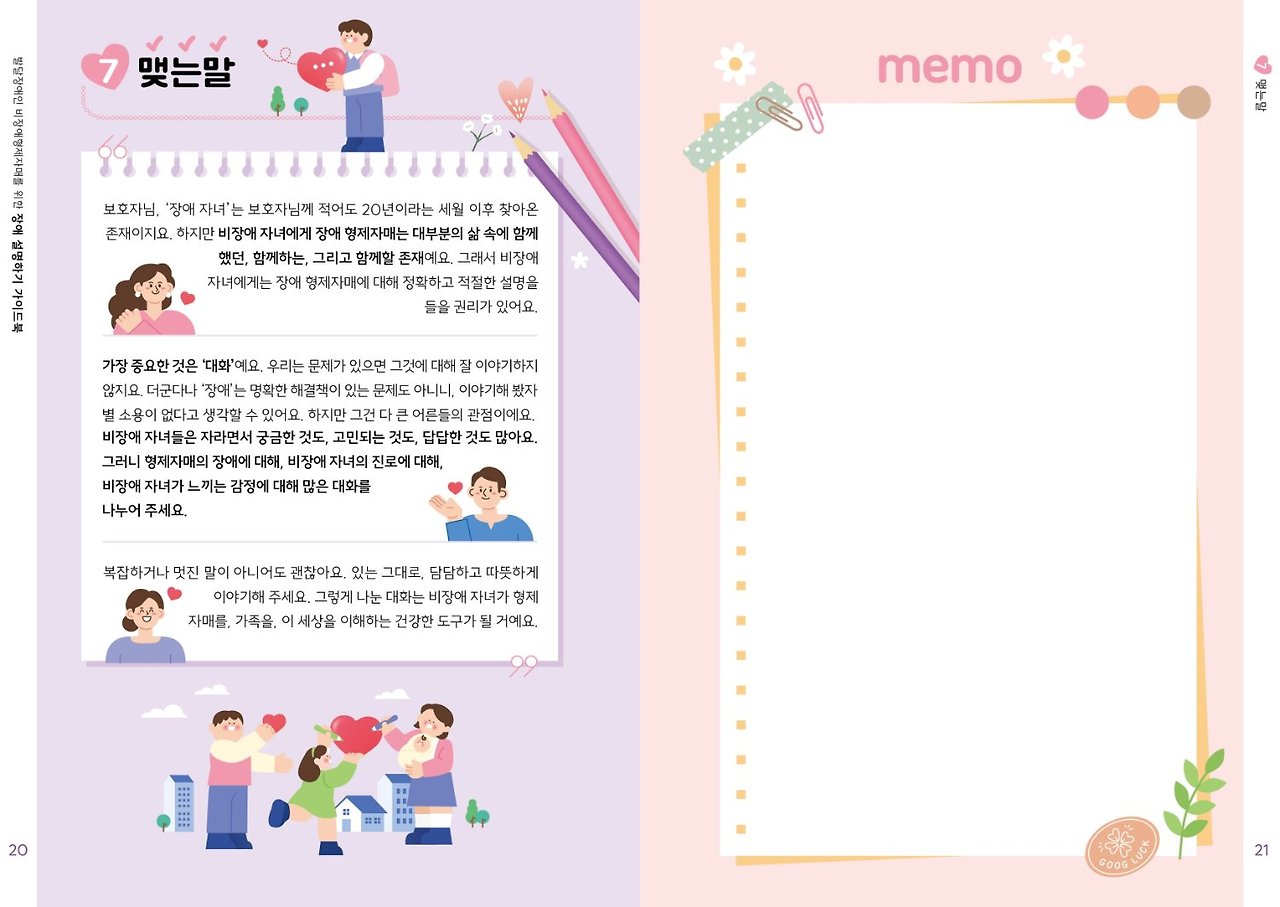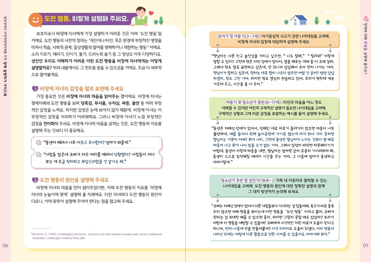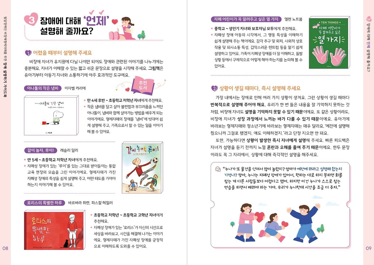 2024년 8월에 뉴닉에 <자녀에게 '장애' 설명하기 가이드>라는 아티클을 쓴 적이 있다. 이 아티클을 기반으로 한국장애인개발원, 강원특별자치도 발달장애인지원센터의 도움으로 <발달장애인 비장애형제자매를 위한 장애 설명하기 가이드북>을 내게 되었다. 장애 자녀가 있는 여러 보호자 분들께 실물 자료가 전달되었지만 브런치스토리에도 PDF로 공유하니, 필요하신 분께 전달되었으면 하는 마음이다.